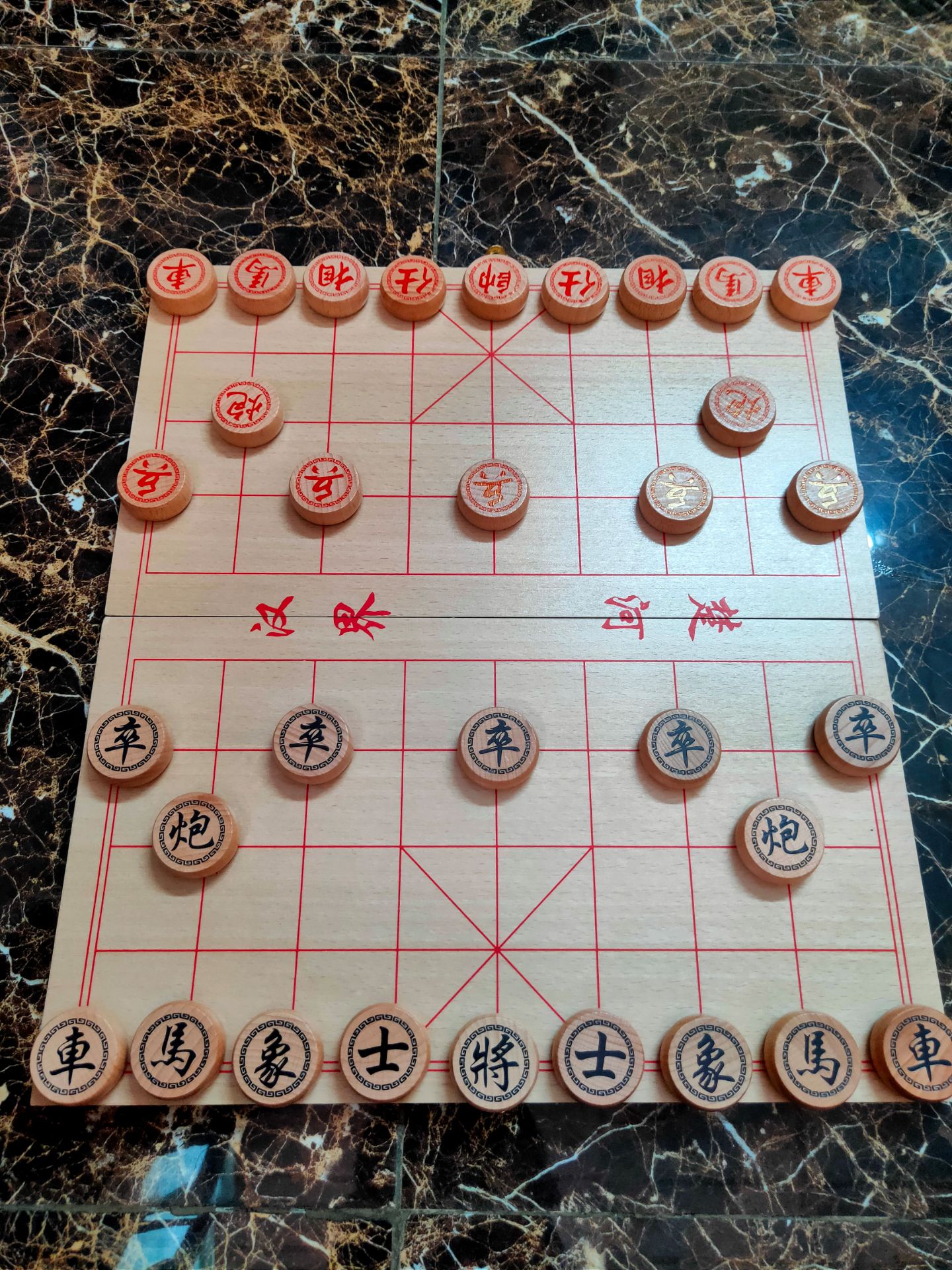 - Một khoảng trống gọi là sông nằm ngang giữa bàn cờ, chia bàn cờ thành hai phần đối xứng bằng nhau. Mỗi bên có một cung Tướng hình vuông do 4 ô hợp thành tại các đường dọc 4, 5, 6 kể từ đường ngang cuối của mỗi bên, trong 4 ô này có vẽ hai đường chéo. Chất Liệu