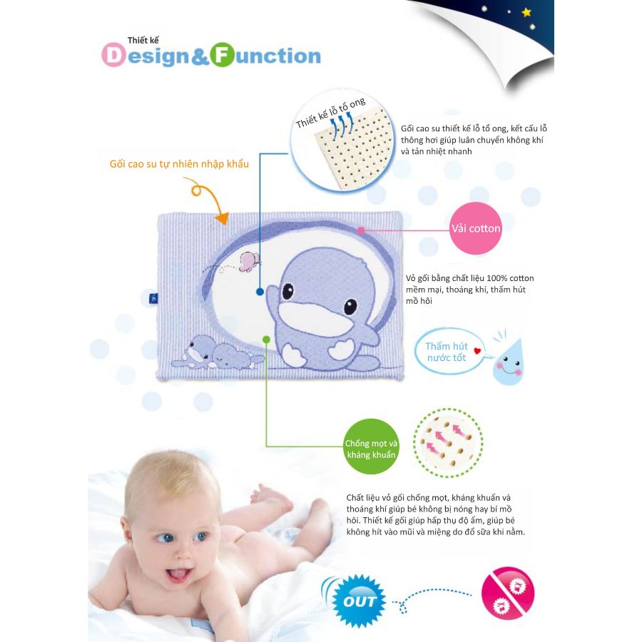 Ruột Gối có thiết kế lỗ tổ ong, giúp gối siêu thoáng khí, thoáng mát. Với công thức kỵ nước, gối nhanh chóng hấp thụ độ ẩm trong vài giây, giúp bé không hít vào mũi và miệng do đổ sữa khi nằm.