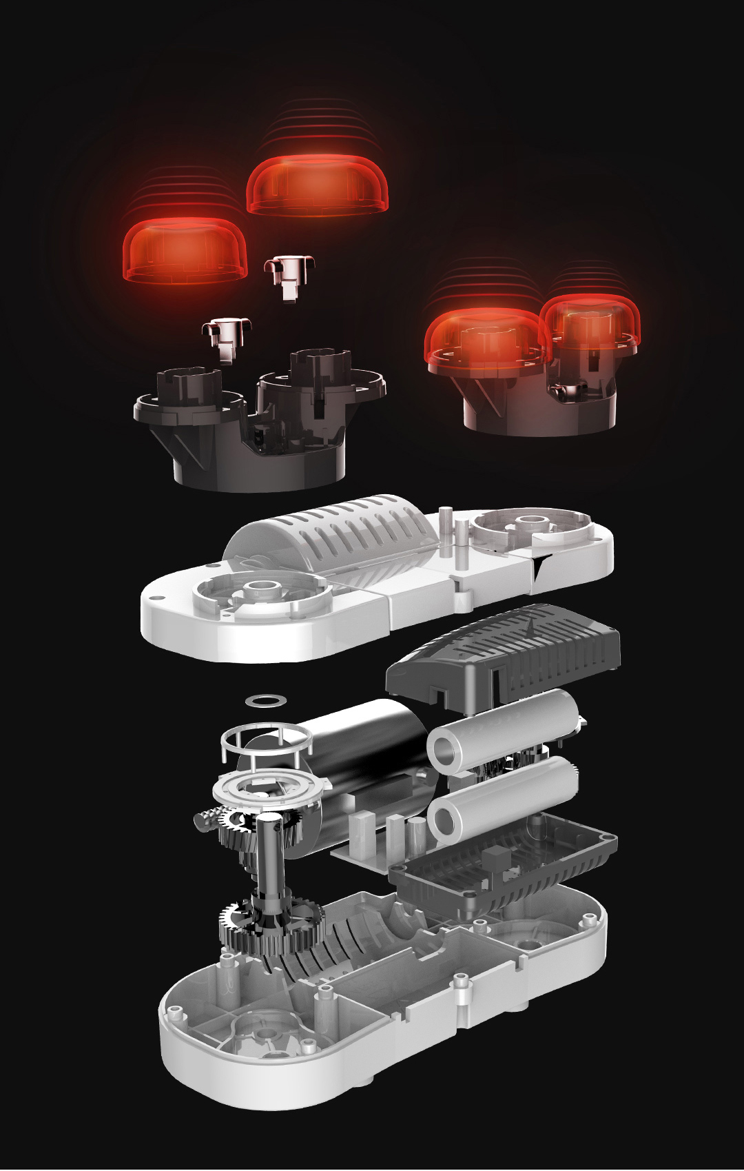 4 con lăn trên máy massage bao gồm 2 con lăn trên cao và 2 con lăn ở vị trí thấp hơn được gia công từ chất liệu nhựa POM chịu nhiệt. Loại nhựa này không những có tính chất cơ học tốt mà còn có độ cứng ổn định khá giống với các kim loại đồng, kẽm, thép, nhôm. Chính vì vậy, con lăn sẽ tạo cảm giác xoa bóp cực đã và thoải mái. Khi thực hiện thao tác massage trên gối, 4 con lăn này sẽ tự động đảo ngược chiều xoa bóp sau mỗi phút. Nhờ vậy mà chúng có thể đánh tan mọi cơn đau nhức, mệt mỏi trên cơ thể người dùng giống như cảm giác được massage tại spa chuyên nghiệp vậy. Sau 15 phút xoa bóp, máy sẽ tự động tắt để đảm bảo cường độ massage vừa đủ cho người dùng.