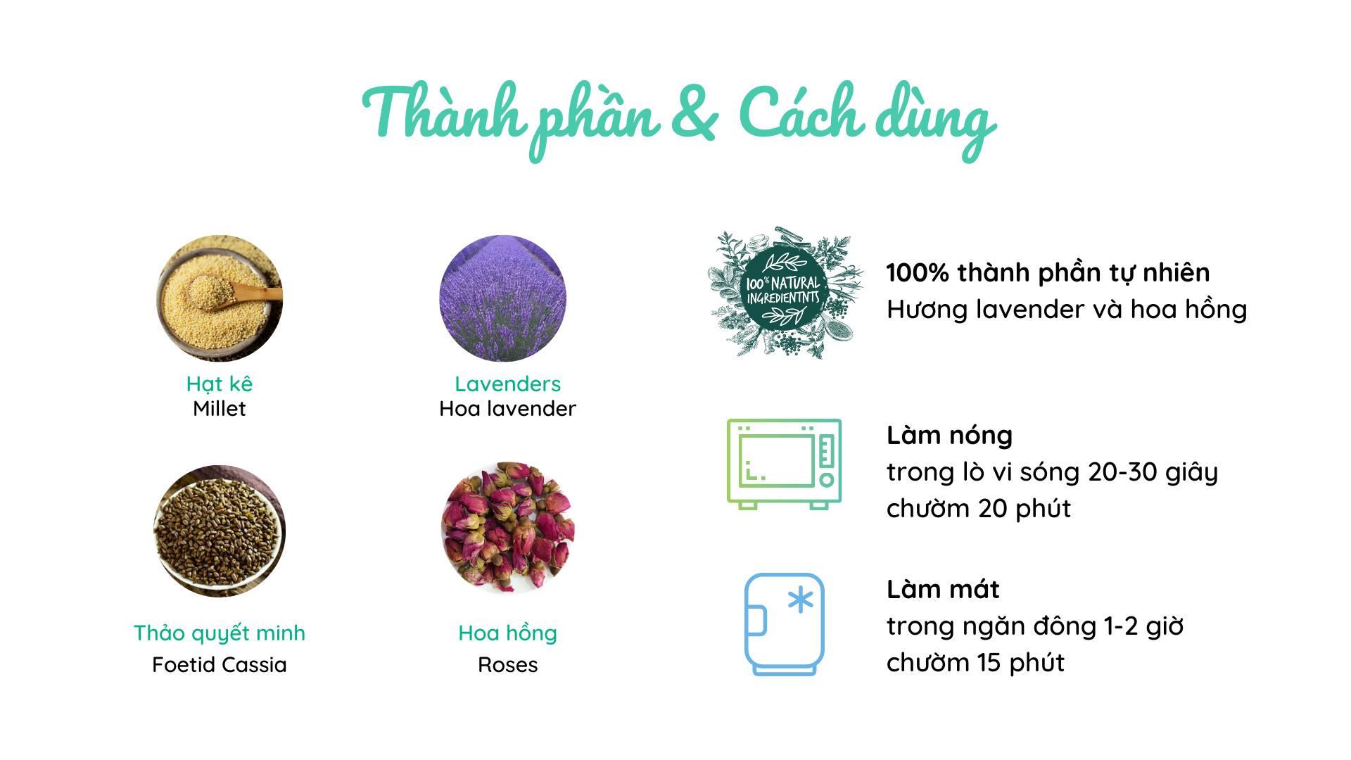 Thành phần: hạt kê, hoa lavender, hoa cúc, hoa hồng