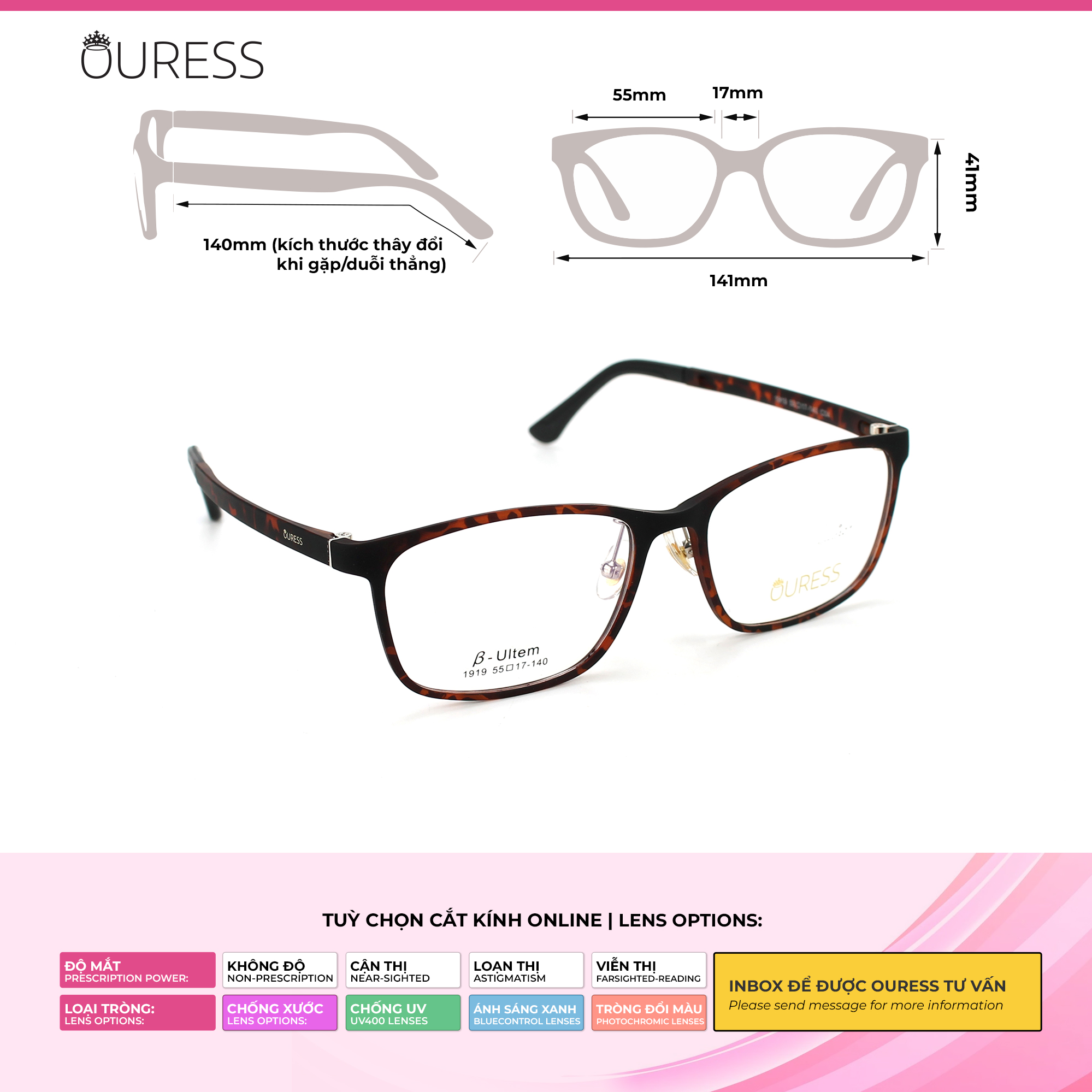 Nhựa Ultem là một trong những chất liệu nổi tiếng trong ngành kính. Đây là nhựa vô định hình với độ bền và độ cứng cơ học cao. Chúng có đầy đủ các đặc tính nhiệt học, kỹ thuật và hoá học ưu việt nên vượt trội trong tất cả các loại. • Gọng kính Ultem có đặc tính siêu nhẹ,độ dẻo dai cao và đàn hồi cực tốt. Nó có thể chịu áp lực nhiệt độ cao, và chịu ma sát tốt • Gọng Ultem không dễ bị biến dạng nên dùng được bền lâu, đặc biệt không gây kích ứng da nên rất an toàn khi sử dụng. • Mẫu mã và kiểu dáng đa dạng, lạ mắt, độc đáo. • Gọng kính được thiết kế nhiều màu sắc tạo nên sự trẻ trung và nhiều sự lựa chọn cho người mang. • Gọng kính thích hợp với nhiều dáng mặt khác nhau, và không kén chọn độ tuổi • Gọng kính lắp được tất cả các loại tròng: cận /viễn / loạn/ lão, với nhiều số độ khác nhau —-------------------------------------- HƯỚNG DẪN CÁCH ĐỌC THÔNG SỐ GỌNG KÍNH Thông thường, nhà sản xuất sẽ in thông số trên tròng kính hoặc càng kính để người dùng hình dung về các kích thước của gọng kính. Ví dụ, trên tròng kính bạn thấy một dãy số: 1919 55-17-140: • 1919: là mã gọng kính • 55: ngang khung tròng kính là 55 mm • 17 : cầu mũi là 17 mm • 140 : chiều dài càng kính 140mm •Cao kính : 41 mm •Chiều ngang tổng thể gọng kính: 141 mm ++ Mã này là size kính dành cho gương mặt vừa và to vừa *** tỷ lệ chênh lệch thông số +/- 2mm. Qúy khách có thể liện hệ shop để được tư vấn chọn gọng kính phù hợp với size gương mặt mình nhé vì đây chỉ là thông số tham khảo —-------------------------------------- Bộ phụ kiện đi kèm theo Kính Ouress gồm: -Khăn lau kính và hộp đựng kính ( bộ phụ kiện này không áp dụng cho những sản phẩm sale trên 40% )