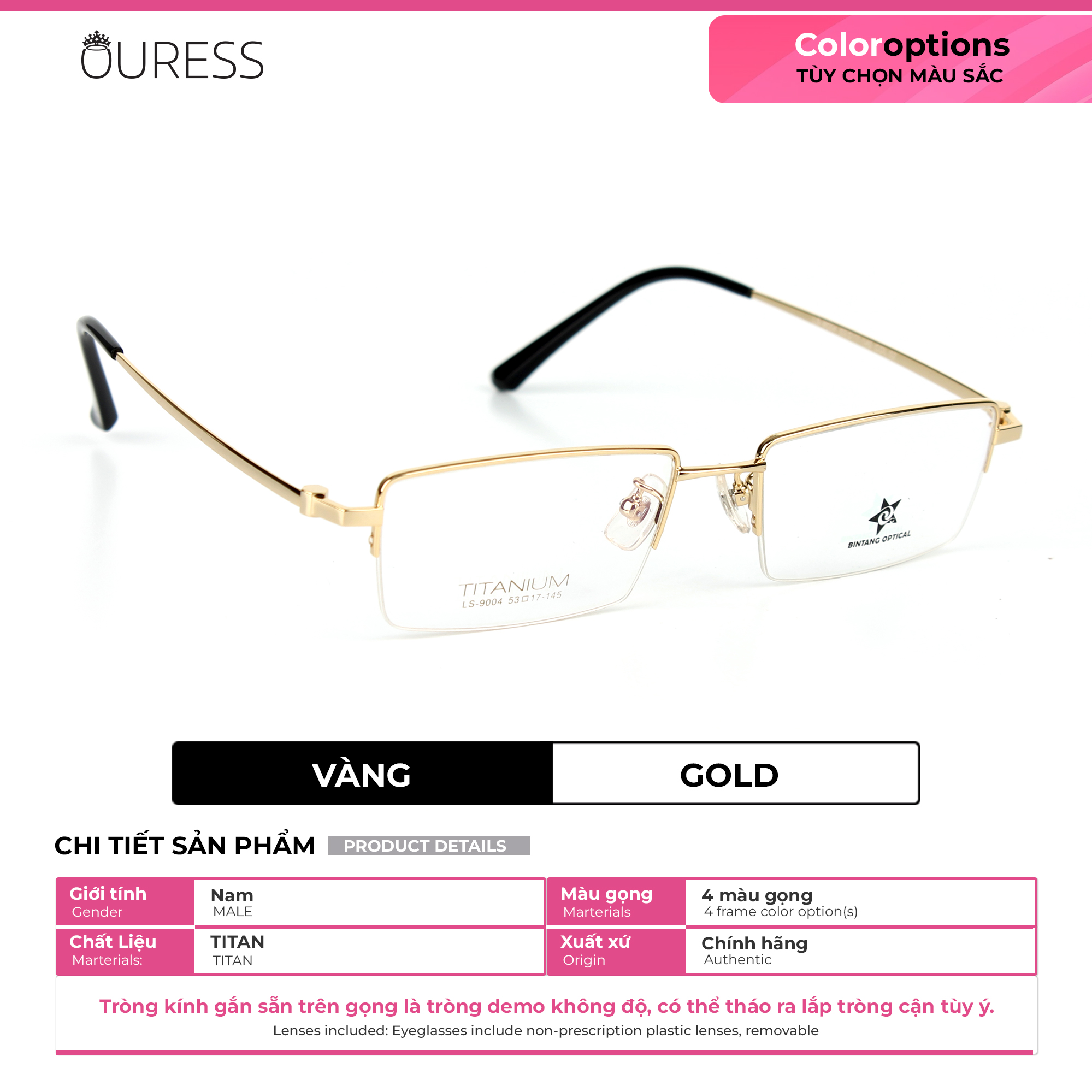 MÔ TẢ CHI TIẾT SẢN PHẨM: -tròng kính thủy tinh sản xuất tại đức - Form kính : vuông - Màu sắc: Vàng - độ từ +0.5- +4.0 - Gọng kiếng đường nét tinh xảo