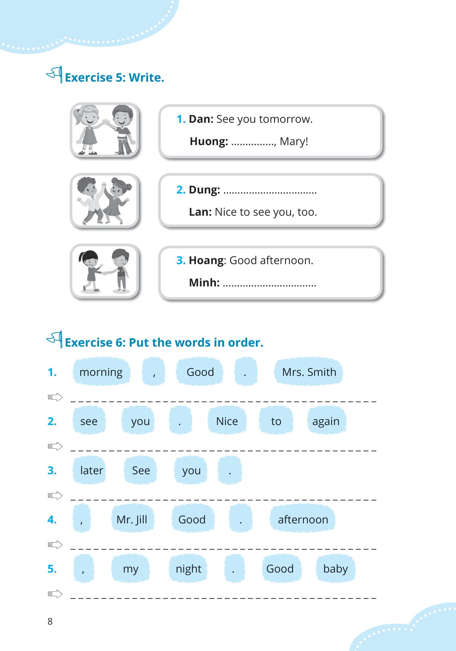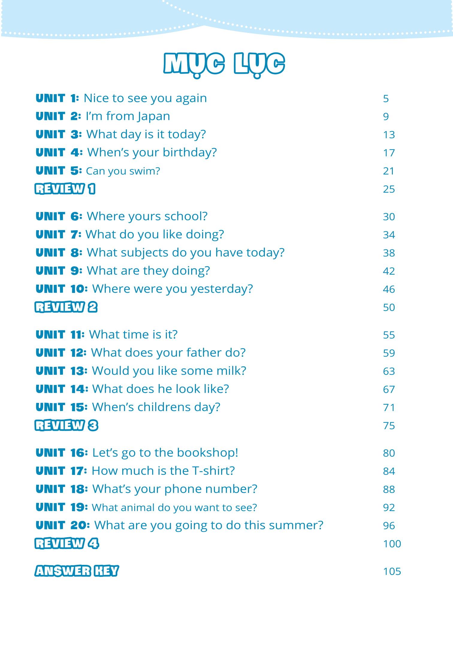 - Cấu trúc sách rất khoa học và logic, giúp các con dễ dàng bắt đầu và tiếp nhận bài học, từ đó học và ghi nhớ kiến thức hiệu quả hơn. Mỗi Unit sẽ được xây dựng với cấu trúc hoàn chỉnh như sau: Mục tiêu bài học → Cấu trúc ngữ pháp → Ví dụ minh họa → Check up (Bài tập ngắn) → Practice (Bài tập thực hành) → Review (Kiểm tra tổng hợp) → Key (Đáp án)