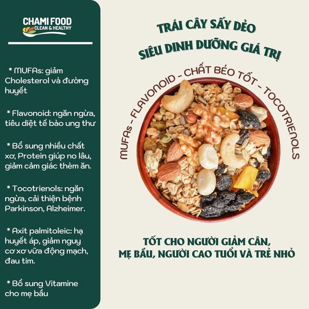 Trái cây sấy dẻo Chami KHÔNG ĐƯỜNG 500G Mix 6 hoa quả Mơ sấy dẻo Chà Là Mận sấy Nho khô Nam việt quất sấy Xoài sấy  Hạt óc chó đỏ ChamiFood Tách vỏ 500G NHẬP KHẨU MỸ CHÍNH NGẠCH LOẠI 1, gấp 3 lần Dưỡng chất, giúp Giảm cân Đẹp dáng.