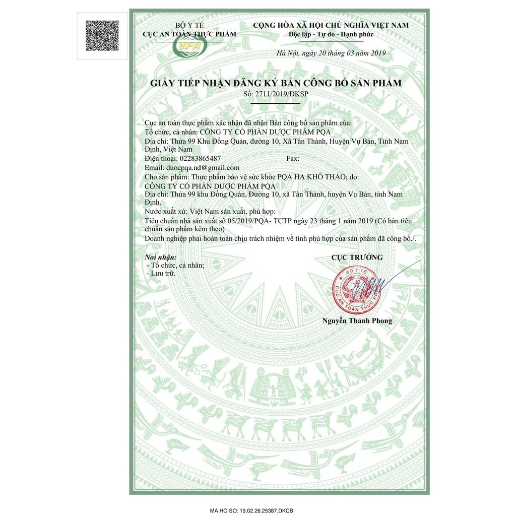 - Địa chỉ sản xuất: Công ty Cổ phần Dược phẩm PQA. Thửa 99, Khu Đồng Quàn, Xã Tân Thành, Huyện Vụ Bản, Tỉnh Nam Định. THÀNH PHẦN: