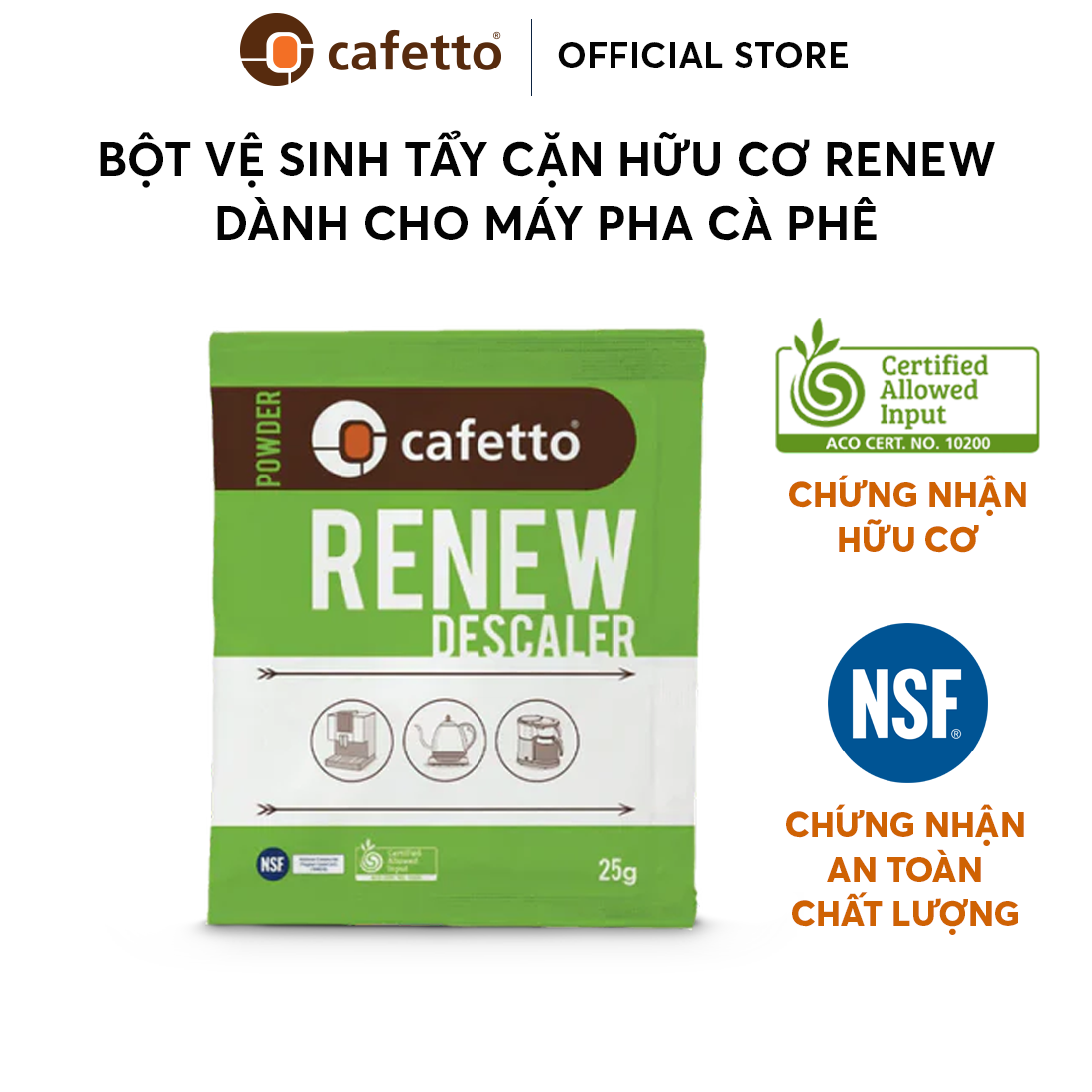 Bột vệ sinh, tẩy cặn (Descaler) hữu cơ máy pha cà phê Cafetto Renew - Renew được NSF công nhận. Sản phẩm đã được thử nghiệm, đánh giá và đạt các tiêu chuẩn về độc