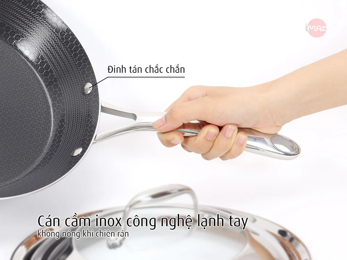 Tay cầm inox lạnh tay: Tay cầm dài, chắc chắn, không nóng trong quá trình nấu.
