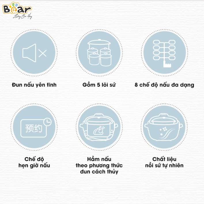 • Dung tích nấu: 1 thố sứ lớn có dung tích 2.5L, 04 thố sứ nhỏ 0.4L, gồm cả Lồng hấp