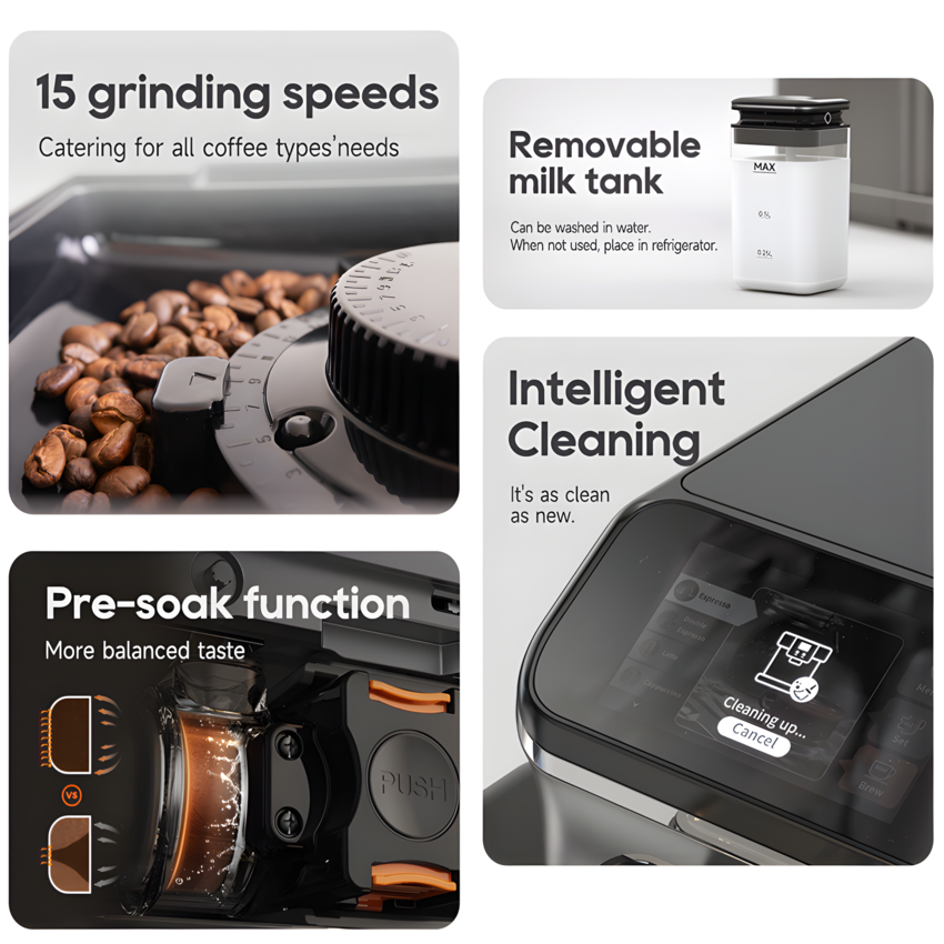Có thể pha 2 tách espresso cùng lúc Thao tác trực quan nhờ màn hình TFT 3,5 inch và các nút cảm ứng cảm biến. Tạo bọt sữa hoàn hảo chỉ với một nút nhấn