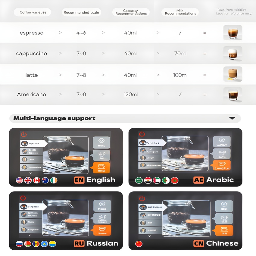 - Một trong những tính năng nổi bật của HiBREW H16 là hoạt động tự động. Chỉ với một nút chạm, người dùng có thể thưởng thức một ly cà phê espresso, cappuccino hoặc latte mới pha mà không cần có kỹ năng barista hoặc đào tạo chuyên sâu. Giao diện thân thiện với người dùng này giúp mọi người trong văn phòng có thể truy cập được, đảm bảo trải nghiệm cà phê nhất quán và thú vị.