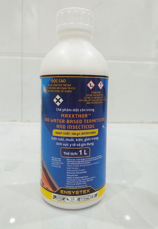 Cty nhập khẩu : Cty TNHH Ensystex VN Cty phân phối : Cty TNHH TM DT Đại Hoàng Gia thành phần : Bifenthrin 10% Maxxthor 100 là chế phẩm diệt côn trùng có hiệu lực cao và tồn lưu lâu, giúp tiêu diệt hiệu quả các loài côn trùng như: ruồi, muỗi, kiến, gián, ve, bọ ché Ưu điểm : - Hạ gục nhanh - Ko mùi - Tồn lưu lâu ( từ 6-8 tuần) - Nhập Mỹ của Tập đoàn nổi tiếng ENSYSTEX - Sử dụng hoạt chất tiên tiên Bifenthrin theo tiêu chuẩn an toàn của Mỹ Tỉ lệ pha : 20 ml cho 1lít nướcCách phun : phun tất cả các nơi mà côn trùng có thể trú ẩn, phun bề mặt tường vì chế phẩm tồn lưu trên tường và các góc tối Sản phẩm này là tài sản cá nhân được bán bởi Nhà Bán Hàng Cá Nhân