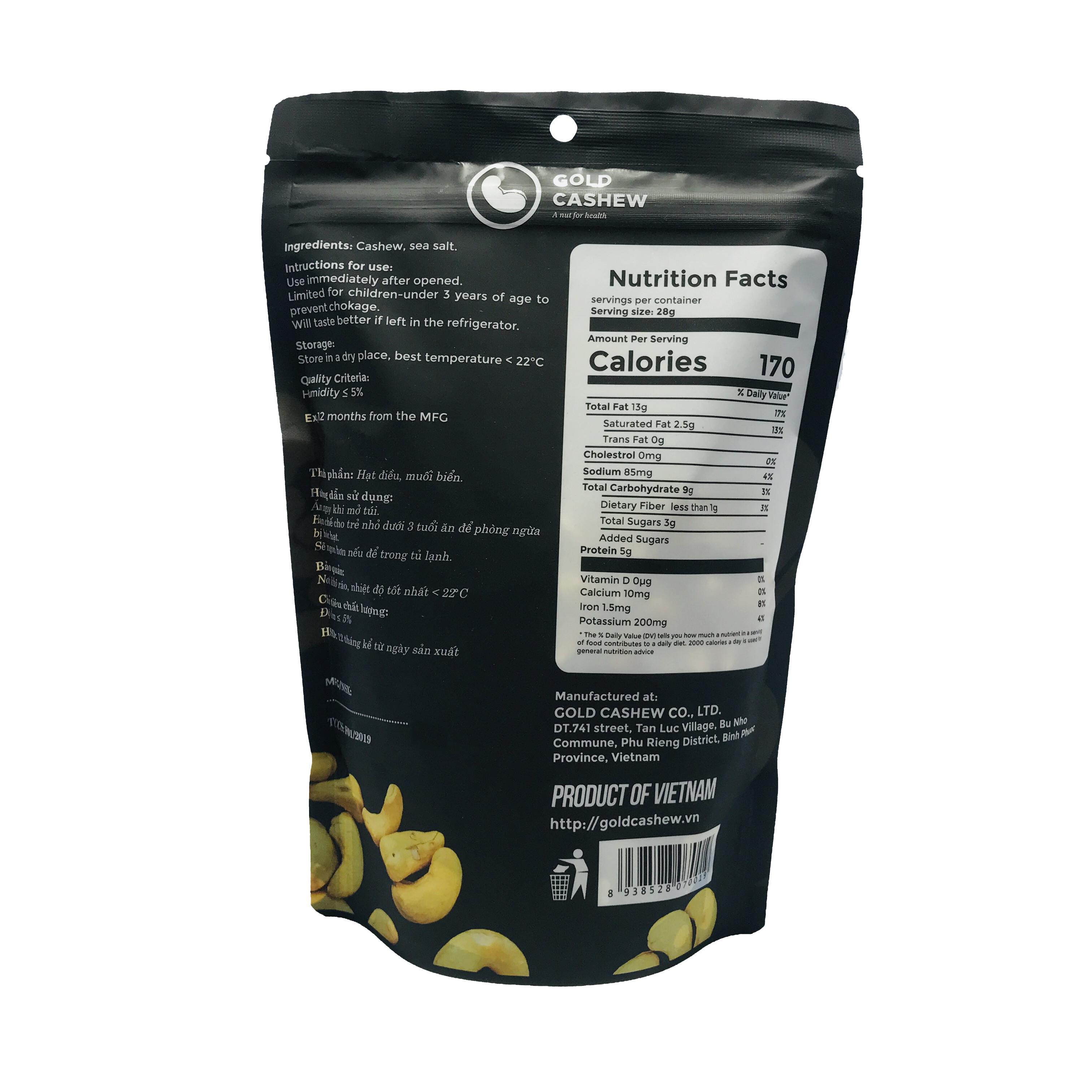 - Thông tin chung Bao bì đóng gói: sử dụng bao bì Nhật Bản tiêu chuẩn Quốc tế của Hiệp hội Bán lẻ Anh Quốc – BRC Food, tuyệt đối an toàn cho sức khỏe của người tiêu dùng. Túi 454g (16 oz) là loại túi zipper có đường zip bền, chịu được áp lực cao nhằm đảm bảo giữ mùi vị của sản phẩm, phù hợp với các tiêu chuẩn xuất khẩu. Thích hợp sử dụng làm quà tặng người thân cùng bạn bè, quà biếu nhân dịp Lễ, Tết và những người sử dụng hạt dinh dưỡng thường xuyên. Hạn sử dụng: 12 tháng kể từ ngày sản xuất Hướng dẫn sử dụng: dùng trực tiếp sau khi mở túi, thích hợp khi dùng chung với các loại thức uống giải khát. Hạn chế cho trẻ nhỏ dưới 3 tuổi sử dụng.