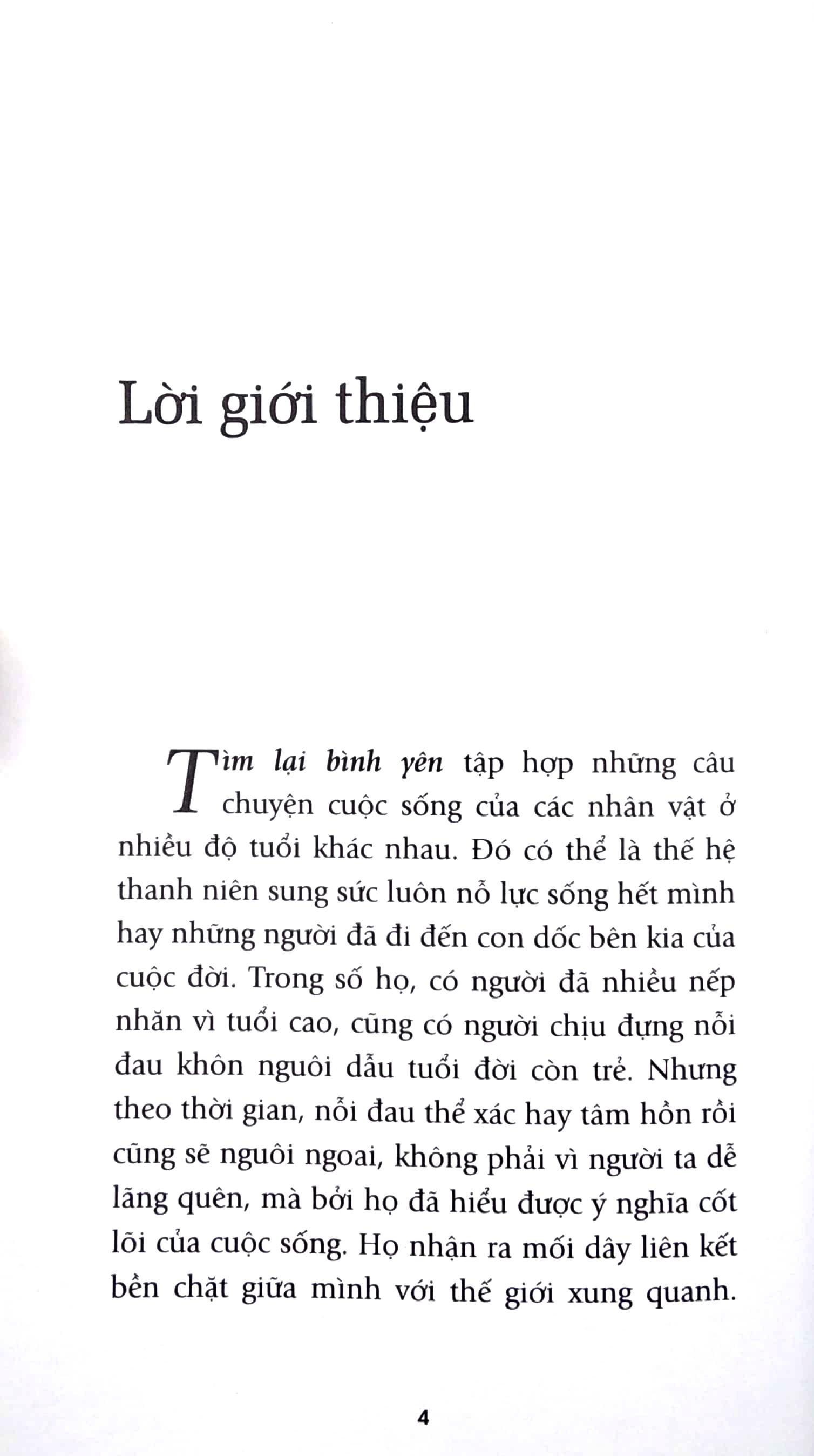 “Không có kết thúc. Không có khởi đầu. Chỉ có niềm đam mê bất diệt dành cho cuộc sống.”(Federico Fellini), như Ruth Heidrich, Tiến sĩ Triết học không may mắc bệnh ung thư vú, sau những phút tuyệt vọng đã đứng lên giành lấy sự sống bằng tất cả sức lực của m.ình và rất nhiều những nhân vật khác; các câu chuyện khác trong “Tìm lại bình yên” sẽ cho bạn đọc sẽ nhận thấy tình yêu thương cuộc sống này là vô cùng sâu sắc và mãnh liệt.