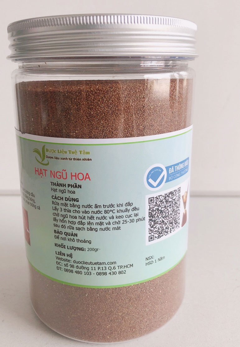 - Giúp làn da khoẻ mạnh, sáng đẹp Hạt ngũ hoa THÔNG TIN VỀ SẢN PHẨM Tên sản phẩm: Hạt ngũ hoa Nguồn gốc: Hưng Yên Ngày sản xuất: Ghi trên bào bì Hạn sử dụng: 12 tháng kể từ ngày sản xuất Hạt ngũ hoa CÁCH DÙNG HẠT NGŨ HOA Rửa mặt bằng nước ấm trước khi đắp Lấy 3 thìa cho vào nước 80°C khuấy đều chờ ngũ hoa hút hết nước và keo cục lại Lấy hổn hợp đắp lên mặt và chờ 25-30 phút sau đó rữa sạch bằng nước mát