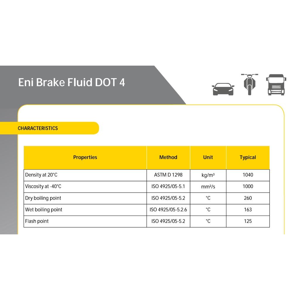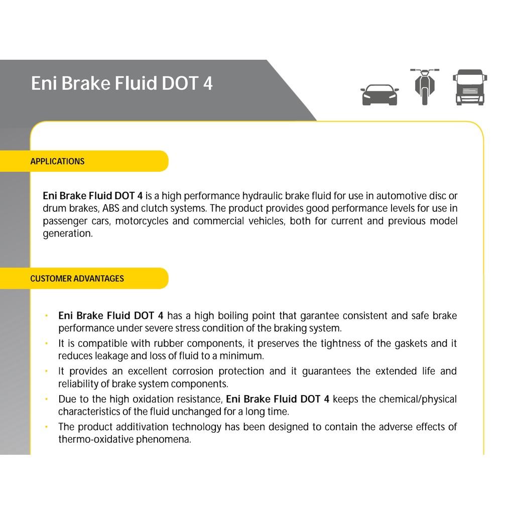 - Eni Brake Fluid DOT 4 là dầu phanh thủy lực hiệu suất cao sử dụng cho phanh đĩa hoặc phanh tang trống, ABS và hệ thống ly hợp. Sản phẩm cung cấp mức hiệu suất tốt để sử dụng cho xe du lịch, xe mô tô và xe thương mại, các dòng xe mới và cũ.