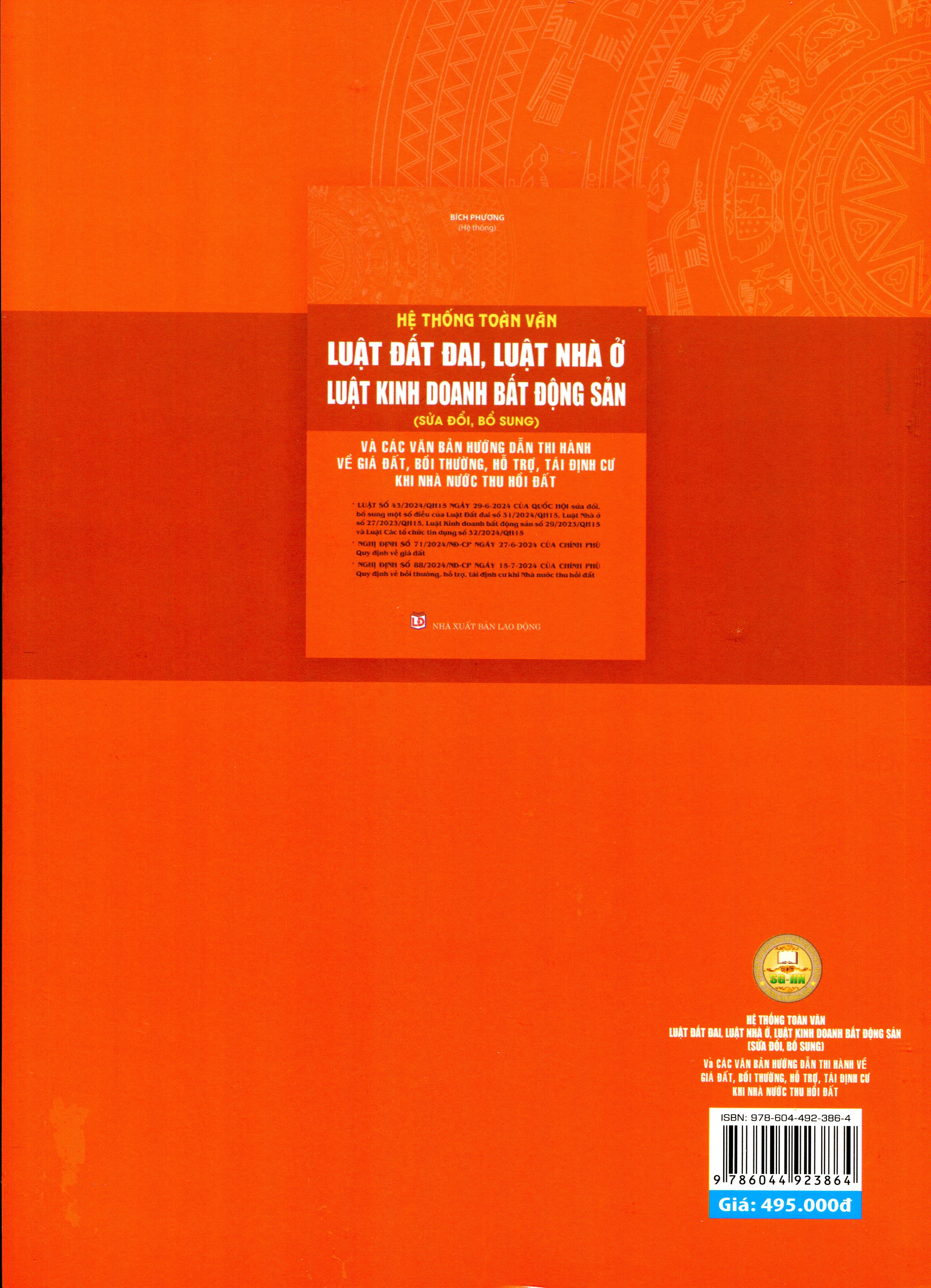 Ngày 18-01-2024, Quốc hội đã thông qua Luật Đất đai số 31/2024/QH15. Theo đó, Luật Đất đai năm 2024 có một số nội dung đáng chú ý như: quy định 32 trường hợp Nhà nước “thu hồi đất để phát triển kinh tế - xã hội vì lợi ích quốc gia, công cộng"; phải hoàn thành bố trí tái định cư trước khi thu hồi đất; bãi bỏ quy định về khung giá đất; mở rộng hạn mức nhận chuyển quyền sử dụng đất nông nghiệp của cá nhân. Luật này có hiệu lực thi hành từ ngày 01-01-2025. Ngày 27-11-2023, Quốc hội đã thông qua Luật Nhà ở số 27/2023/QH15. Theo đó, không quy định thời hạn sở hữu nhà chung cư, chỉ quy định thời hạn sử dụng nhà chung cư; mở rộng thêm 02 nhóm đối tượng được mua nhà ở xã hội bao gồm: 1) học sinh, sinh viên đại học, học viện, cao đẳng, dạy nghề, trường chuyên biệt, và 2) học sinh trường dân tộc nội trú công lập, doanh nghiệp, hợp tác xã, liên hiệp hợp tác xã trong khu công nghiệp. Luật có hiệu lực từ ngày 01-01-2025. Ngày 28-11-2023, Quốc hội đã thông qua Luật Kinh doanh bất động sản số 29/2023/QH15. Theo đó, chủ đầu tư dự án bất động sản chỉ được thu tiền đặt cọc không quá 5% giá bán, cho thuê mua nhà ở, công trình xây dựng, phần diện tích sàn xây dựng trong công trình xây dựng từ bên đặt cọc để mua, thuê mua khi nhà ở, công trình xây dựng đã có đủ các điều kiện đưa vào kinh doanh; doanh nghiệp kinh doanh dịch vụ môi giới bất động sản chỉ cần một người có chứng chỉ hành nghề... Luật có hiệu lực từ ngày 01-01-2025. Ngày 29-6-2024, Quốc hội thông qua  Luật sửa đổi Luật Đất đai, Luật Nhà ở, Luật Kinh doanh bất động sản và Luật Các tổ chức tín dụng , có hiệu lực từ ngày 01-8-2024. Bên cạnh đó, nhiều văn bản quy định về bồi thường, hỗ trợ, tái định cư khi Nhà nước thu hồi đất và quy định về giá đất cũng được Chính phủ ban hành như: Nghị định 88/2024/NĐ-CP ngày 15-7-2024  quy định về bồi thường, hỗ trợ, tái định cư khi Nhà nước thu hồi đất; Nghị định 71/2024/NĐ-CP ngày 27-6-2024 quy định về giá đất. Nhằm giúp các cơ quan, tổ chức, cá nhân hoạt động trong lĩnh vực đất đai, nhà ở, kinh doanh bất động sản và bạn đọc quan tâm đến những quy định mới nêu trên, Nhà xuất bản Lao Động phối hợp với PHÁP LUẬT SÀI GÒN HÀ NỘI xuất bản cuốn sách: HỆ THỐNG TOÀN VĂN LUẬT ĐẤT ĐAI, LUẬT NHÀ Ở, LUẬT KINH DOANH BẤT ĐỘNG SẢN (SỬA ĐỔI, BỔ SUNG) VÀ CÁC VĂN BẢN HƯỚNG DẪN THI HÀNH VỀ GIÁ ĐẤT, BỒI THƯỜNG, HỖ TRỢ, TÁI ĐỊNH CƯ KHI NHÀ NƯỚC THU HỒI ĐẤT. Cuốn sách gồm có các phần chính sau đây: Phần thứ nhất: Luật Đất đai của Quốc hội, số 31/2024/QH15 Phần thứ hai: Luật Nhà ở của Quốc hội, số 27/2023/QH15 Phần thứ ba: Luật Kinh doanh bất động sản của Quốc hội, số 29/2024/QH15 Phần thứ tư: Luật sửa đổi, bổ sung Luật Đất đai, Luật Nhà ở, Luật Kinh doanh bất động sản Phần thứ năm: Quy định về bồi thường, hỗ trợ, tái định cư khi Nhà nước thu hồi đất Phần thứ sáu: Quy định về giá đất Sách có độ dày gần 520 trang, giá phát hành 495.000đ/1 quyển 2 Trân trọng giới thiệu cuốn sách đến quý độc giả.