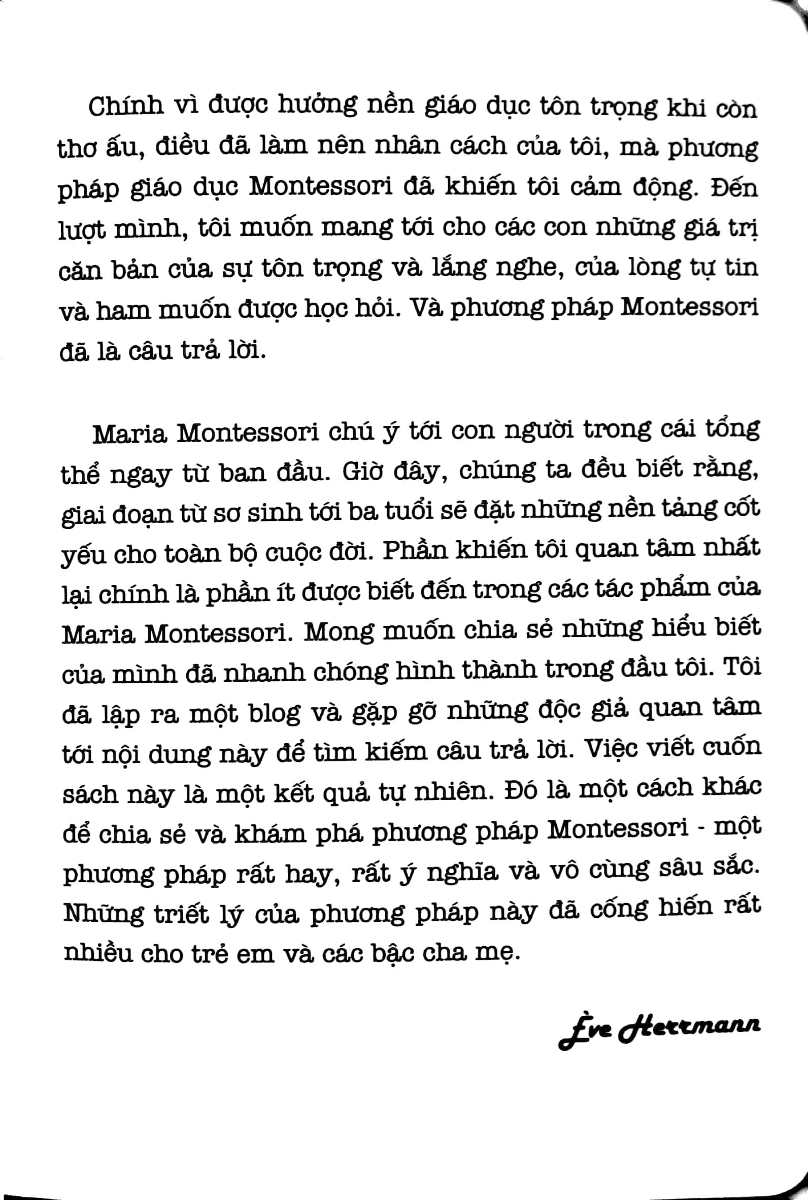 Sách: Giáo Dục Motessori Tại Nhà Maria Montessori từng nói:"Trẻ em sinh ra để học tập, phát triển cũng như cải thiện các hành vi, và chúng rất thích điều đó. Các nhà tâm lí