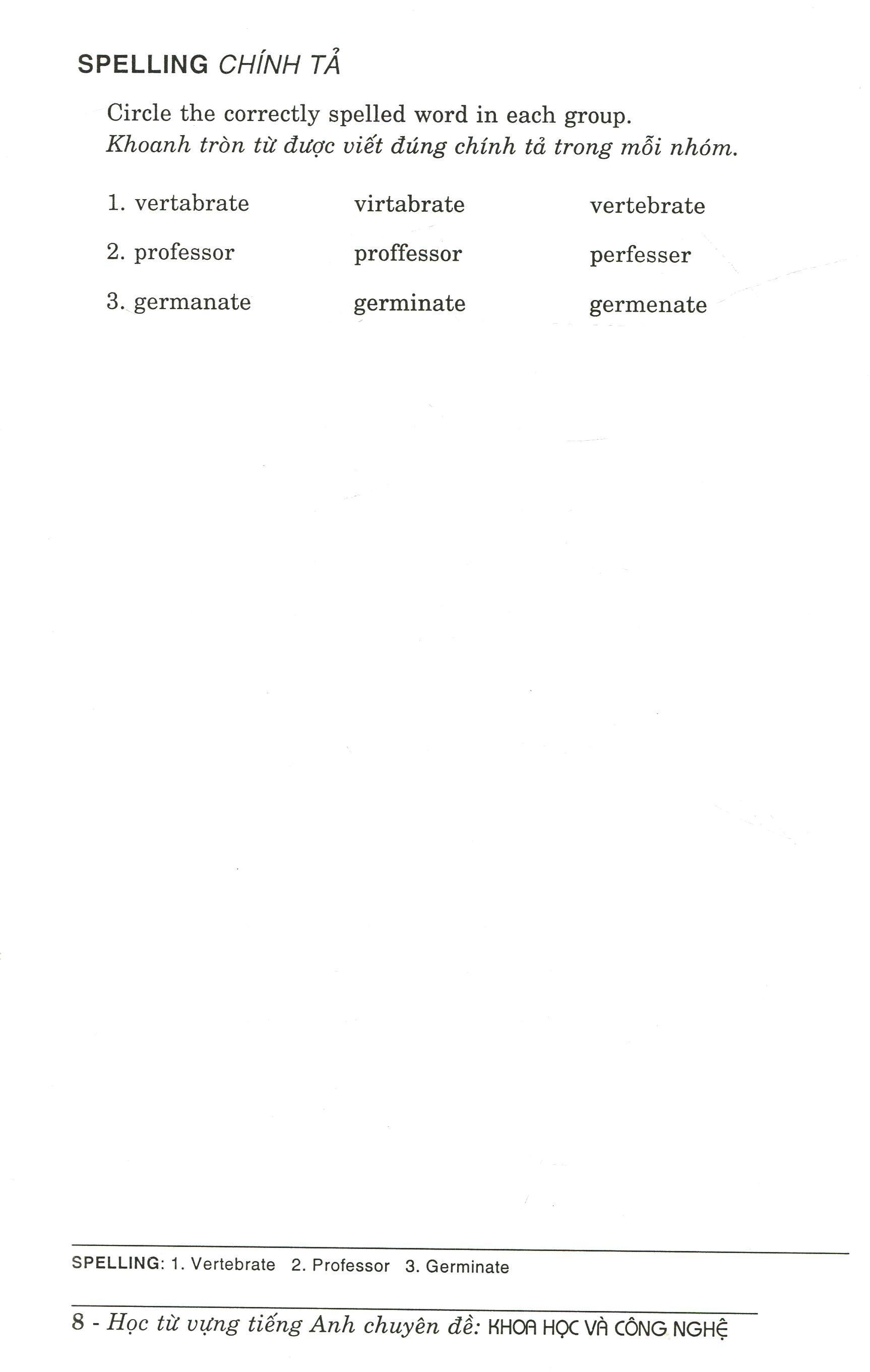 Mua tại TiktokHọc Từ Vựng Tiếng Anh Chuyên Đề Khoa Học & Công Nghệ Bộ sách "Học Từ Vựng Tiếng Anh Chuyên Đề" được biên soạn đặc biệt dành cho bạn, những người yêu thích môn tiếng Anh và muốn sử dụng tiếng Anh làm công cụ giao tiếp trong công việc hoặc trong các cuộc giao lưu thông thường. Bộ sách gồm 5 quyển, được thiết kế với hàng trăm bài tập về từ vựng nhằm giúp bạn mở rộng vốn từ ở nhiều lĩnh vực như Lịch sử và Địa ; Âm nhạc, Nghệ thuật và Văn học; Nơi làm việc và Nghề nghiệp; và Đời sống hằng ngày .