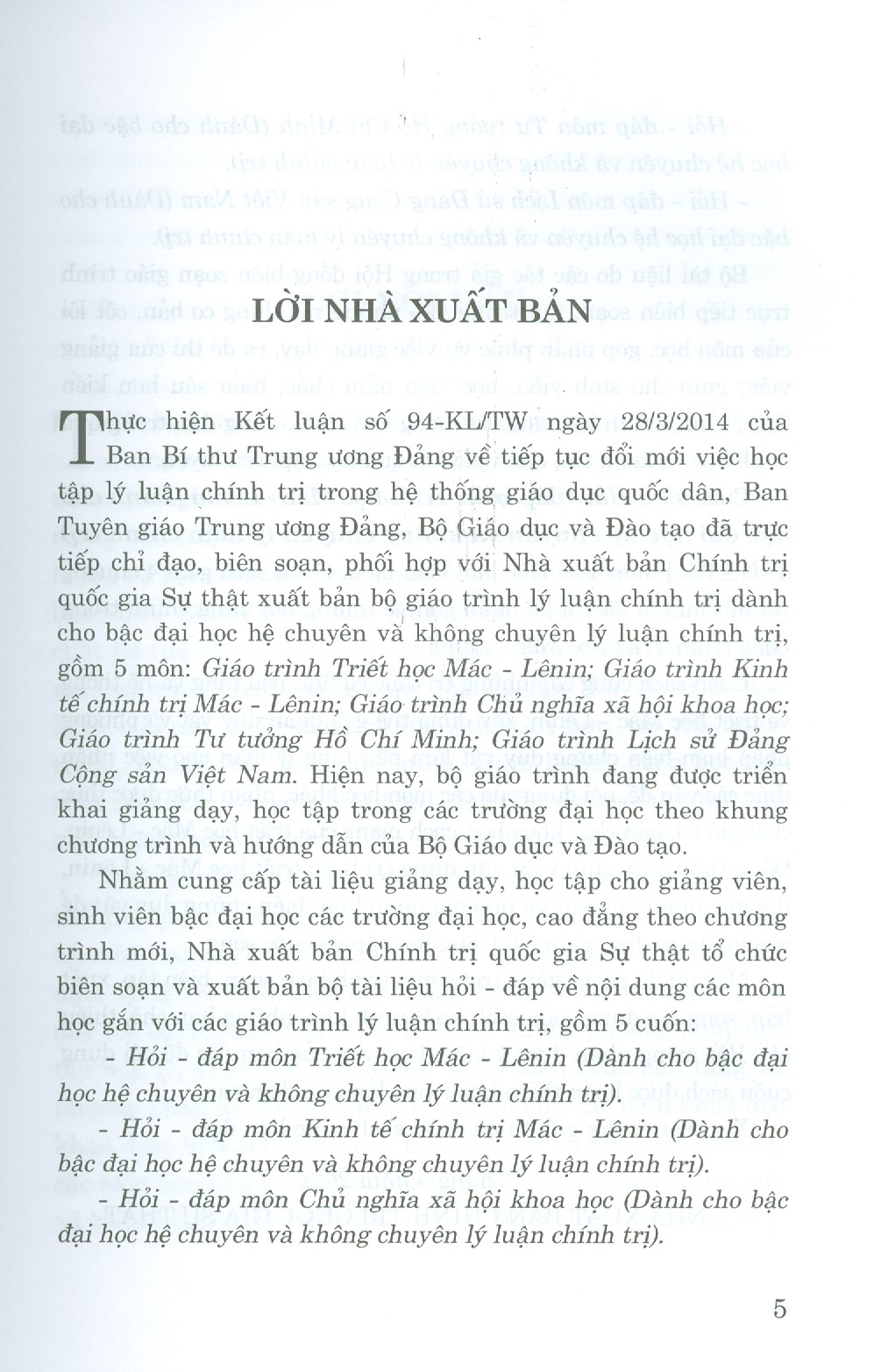 Bộ giáo trình lý luận chính trị gồm 5 cuốn dành cho bậc đại học hệ không chuyên lý luận chính trị. Bộ sách là tài liệu giảng dạy, học tập cho giảng viên, sinh
