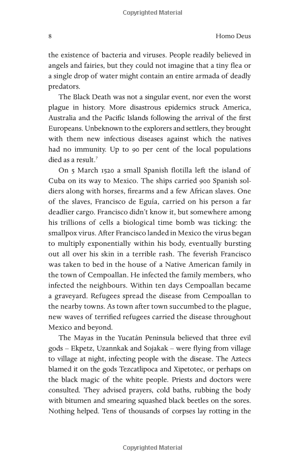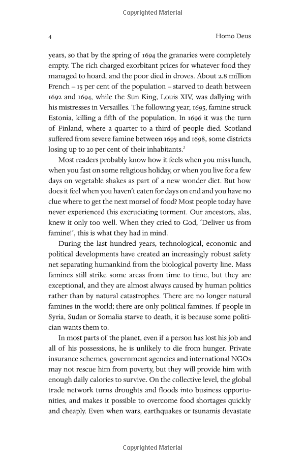 Over the past century humankind has managed to do the impossible and rein in famine, plague, and war. This may seem hard to accept, but, as Harari explains in his trademark style--thorough, yet riveting--famine, plague and war have been transformed from incomprehensible and uncontrollable forces of nature into manageable challenges. For the first time ever, more people die from eating too much than from eating too little; more people die from old age than from infectious diseases; and more people commit suicide than are killed by soldiers, terrorists and criminals put together. The average American is a thousand times more likely to die from binging at McDonalds than from being blown up by Al Qaeda.