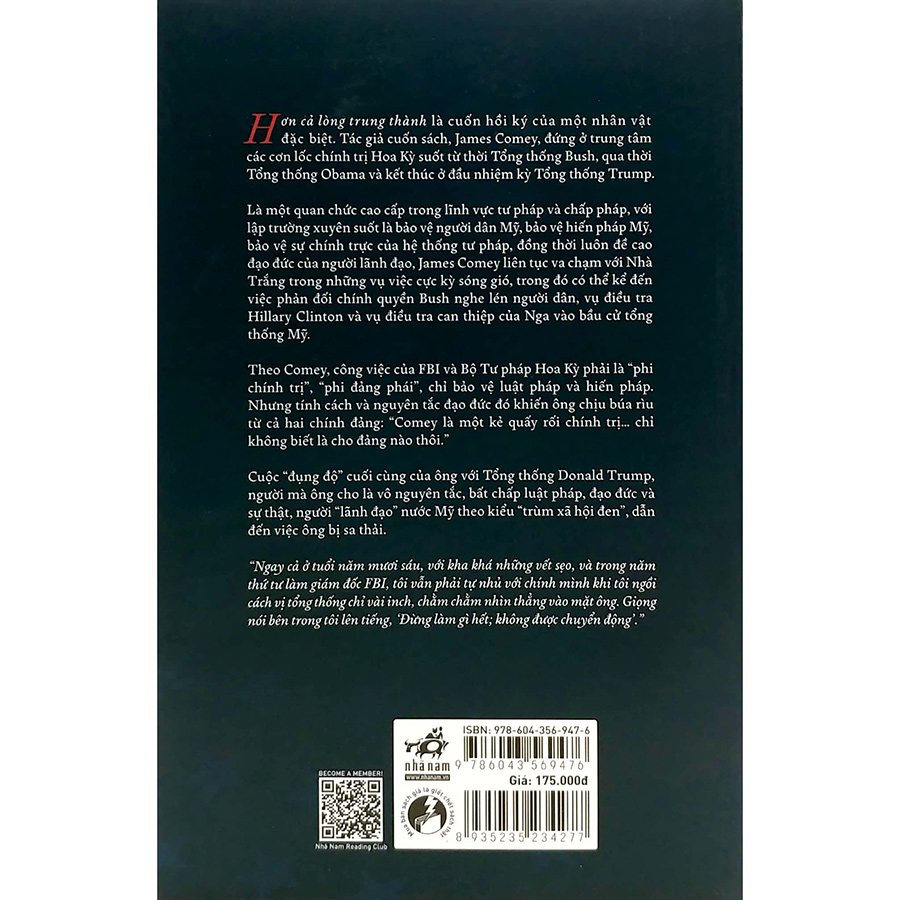 Hơn cả lòng trung thành là cuốn hồi ký của một nhân vật đặc biệt. Tác giả cuốn sách, James Comey, đứng ở trung tâm các cơn lốc chính trị Hoa Kỳ suốt từ thời Tổng thống Bush, qua thời Tổng thống Obama và kết thúc ở đầu nhiệm kỳ Tổng thống Trump. Là một quan chức cao cấp trong lĩnh vực tư pháp và chấp pháp, với lập trường xuyên suốt là bảo vệ người dân Mỹ, bảo vệ hiến pháp Mỹ, bảo vệ sự chính trực của hệ thống tư pháp, đồng thời luôn đề cao đạo đức của người lãnh đạo, James Comey liên tục va chạm với Nhà Trắng trong những vụ việc cực kỳ sóng gió, trong đó có thể kể đến việc phản đối chính quyền Bush nghe trộm người dân, vụ điều tra Hillary Clinton và vụ điều tra can thiệp của Nga vào bầu cử tổng thống Mỹ. Theo Comey, công việc của FBI và Bộ Tư pháp Hoa Kỳ phải là “phi chính trị”, “phi đảng phái”, chỉ bảo vệ luật pháp và hiến pháp. Nhưng tính cách và nguyên tắc đạo đức đó khiến ông chịu búa rìu từ cả hai chính đảng: “Comey là một kẻ quấy rối chính trị chỉ không biết là cho đảng nào thôi.” Cuộc “đụng độ” cuối cùng của ông với Tổng thống Donald Trump, người mà ông cho là vô nguyên tắc, bất chấp luật pháp, đạo đức và sự thật, người “lãnh đạo” nước Mỹ theo kiểu “trùm xã hội đen”, dẫn đến việc ông bị sa thải. “Ngay cả ở tuổi năm mươi sáu, với kha khá những vết sẹo, và trong năm thứ tư làm giám đốc FBI, tôi vẫn phải tự nhủ với chính mình khi tôi ngồi cách vị tổng thống chỉ vài inch, chằm chằm nhìn thẳng vào mặt ông. Giọng nói bên trong tôi lên tiếng, 'Đừng làm gì hết; không được chuyển động!'.” JAMES BRIEN "JIM" COMEY JR. từng là Giám đốc thứ bảy của Cục Điều tra Liên bang Hoa Kỳ (FBI) từ tháng Chín năm 2013 cho đến khi bị Tổng thống Donald Trump sa thải vào tháng Năm năm 2017. Comey đã trải qua nhiều chức vụ trong chính quyền Mỹ, là Luật sư Liên bang phụ trách Quận Nam New York, Phó Tổng Chưởng lý Hoa Kỳ (quan chức cấp cao thứ hai tại Bộ Tư pháp Hoa Kỳ) dưới thời George Bush (con). Tháng Chín năm 2013, Comey được Tổng thống Barack Obama bổ nhiệm là Giám đốc FBI. Ông là viên chức cao cấp duy nhất trong nội các Obama còn tại vị dưới chính quyền Trump trước khi bị sa thải một cách đầy cay đắng, y như trong show truyền hình thực tế The Apprentice, với câu nói nổi tiếng của Trump: "You're fired".