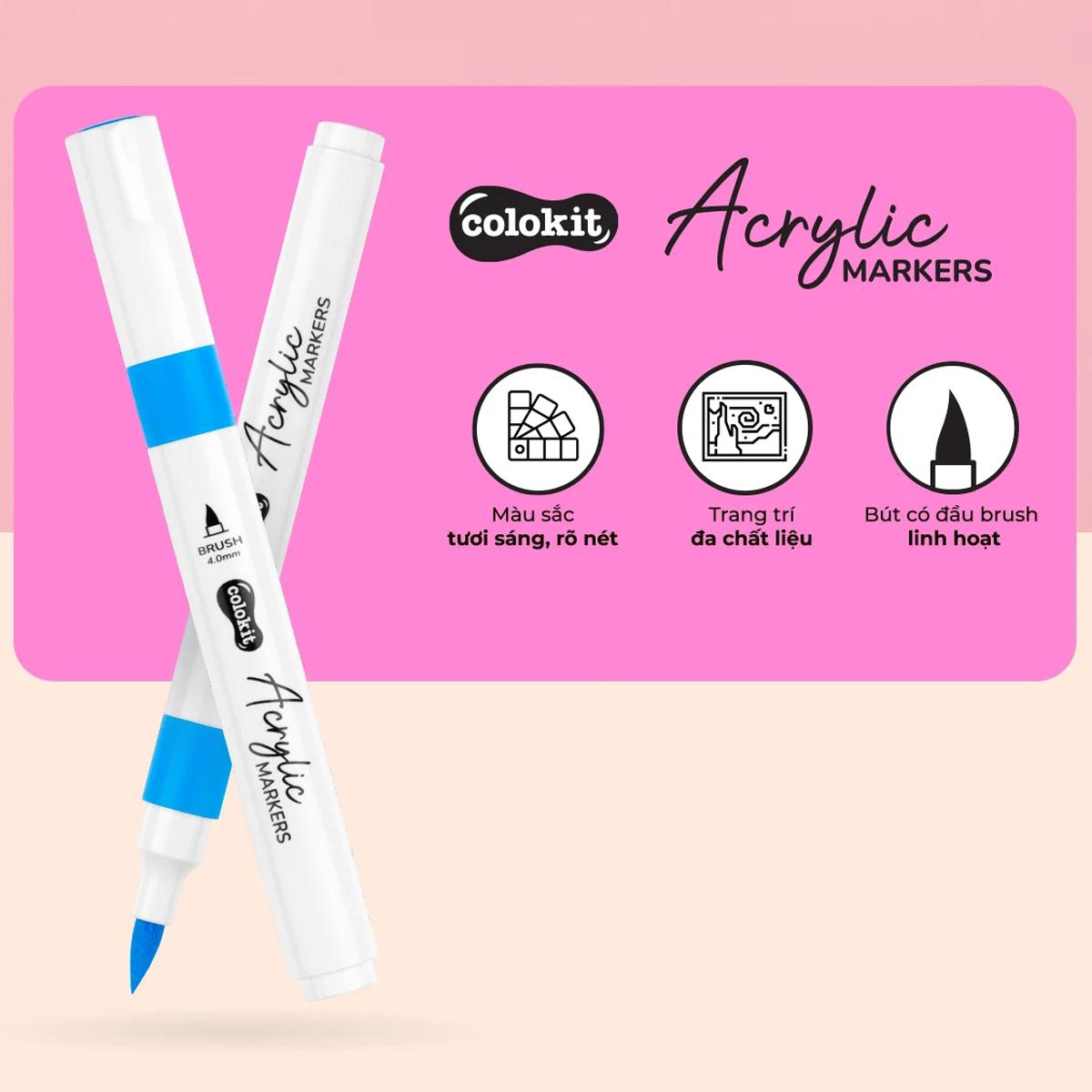 Hộp 24 Bút Lông Màu Acrylic Markers 2 Đầu - Colokit ACM-C002 với thiết kế đầu BROAD tiện lợi và đầu BRUSH linh hoạt đáp ứng được đa dạng nhu cầu sử dụng. Bút màu