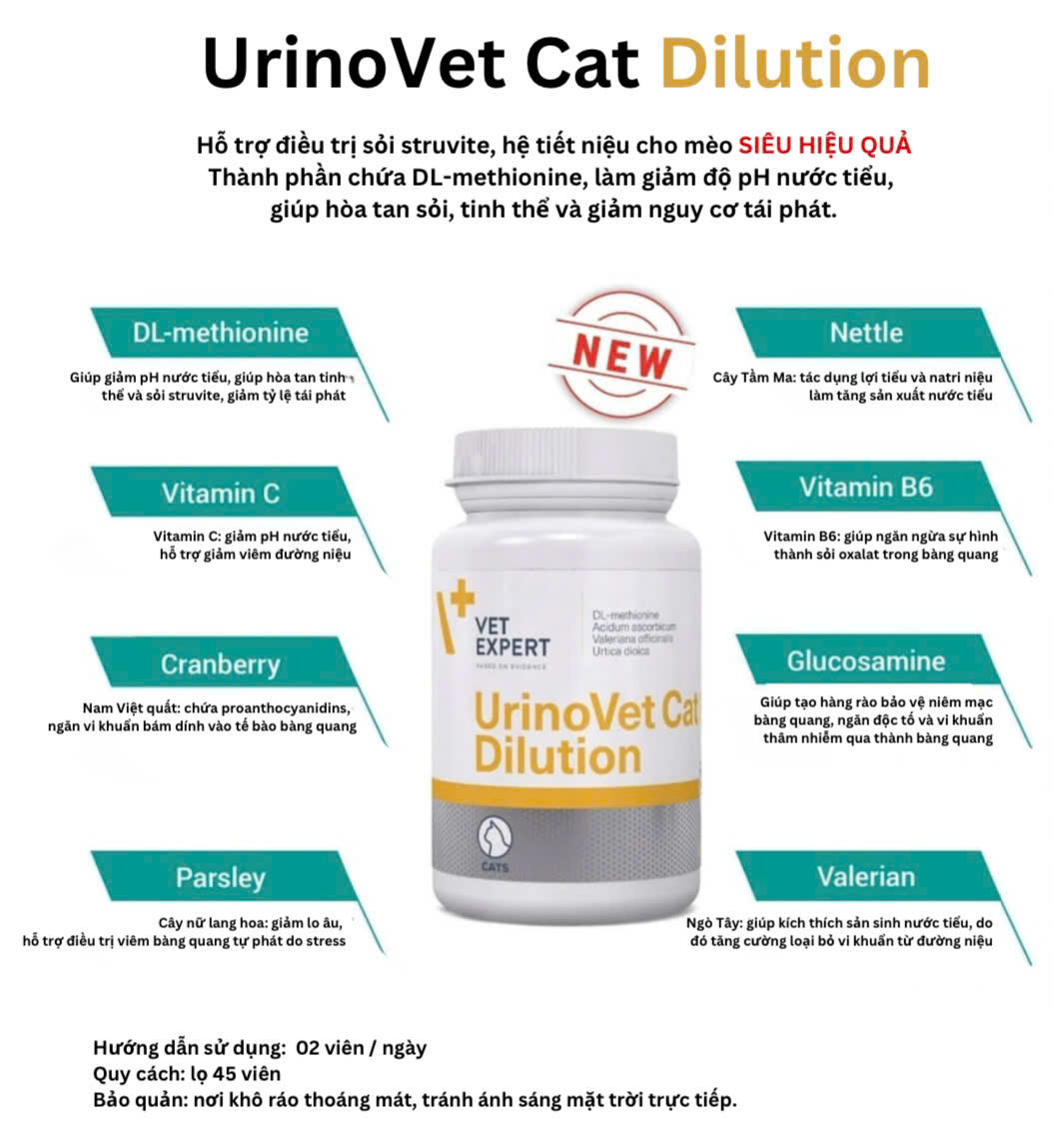 Sản phẩm hỗ trợ điều trị sỏi thận Struvite cho mèo UrinoVet Cat Dilution Sản phẩm có chứa: DL-methionine giúp làm giảm pH nước tiểu, hoà tan tinh thể struvite hiện có và giảm nguy