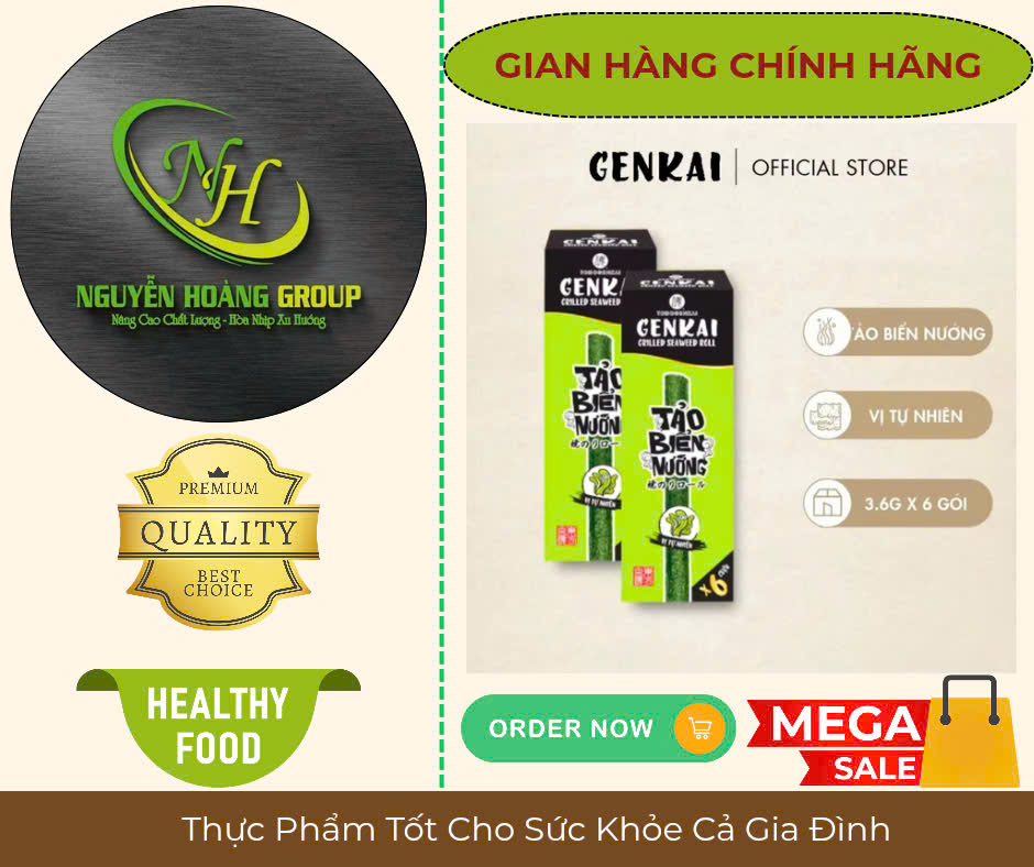 Tên sản phẩm: RONG BIỂN NƯỚNG CUỘN Có 2 Vị : Tự Nhiên & Vị Cay NÓNG Thành phần: Rong biển 68%, dầu ngô 26.7%, dầu mè 4.3%, muối biển 1% Lá Rong biển có