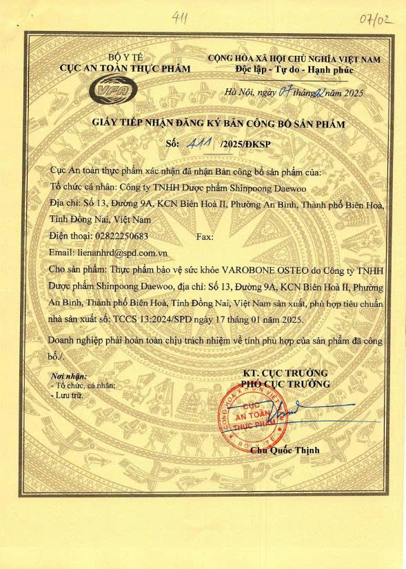 Đặt cam kết: “Vì sức khỏe mọi người” vào từng sản phẩm, Shinpoong Pharma không ngừng nỗ lực tạo nên những giải pháp toàn diện về sức khỏe dựa trên gần 63 năm nghiên cứu khoa học, thành tựu về công nghệ và nguyên liệu chất lượng nhập khẩu, tuyển chọn từ các chuyên gia hàng đầu tại Hàn Quốc và Việt Nam. THỰC PHẨM BẢO VỆ SỨC KHỎE | VAROBONE OSTEO - Viên uống bổ sung CALCI, Vitamin D3 Hỗ trợ cải thiện tình trạng loãng xương ở người lớn; cải thiện xương và răng chắc khỏe THÀNH PHẦN - Calci carbonat (tương đương 400 mg Calci) . 1000 mg - Magnesi oxyd (tương đương 120 mg Magnesi) ... 199 mg - Kẽm gluconat (tương đương 10 mg Kẽm) ... 70 mg - Vitamin B6 (dưới dạng Pyridoxin hydroclorid) .... 2 mg - Vitamin D3 (dưới dạng Cholecalciferol) . 400 IU CÔNG DỤNG: Hỗ trợ cải thiện răng và xương chắc khỏe. Hỗ trợ cải thiện tình trạng loãng xương ở người lớn. Bổ sung Calci, vitamin D3 cho cơ thể. CÁCH DÙNG Người lớn và trẻ em trên 14 tuổi: 1 viên/lần x 1 – 2 lần/ngày, uống sau khi ăn sáng và ăn trưa. ĐỐI TƯỢNG SỬ DỤNG Người lớn và trẻ em trên 14 tuổi, phụ nữ có thai và cho con bú có nhu cầu bổ sung Calci, vitamin D3 cho cơ thể. Người lớn bị loãng xương BẢO QUẢN Trong bao bì kín, ở nơi khô, tránh ánh sáng, nhiệt độ dưới 30ºC. HSD: 36 tháng kể từ ngày sản xuất. QUY CÁCH