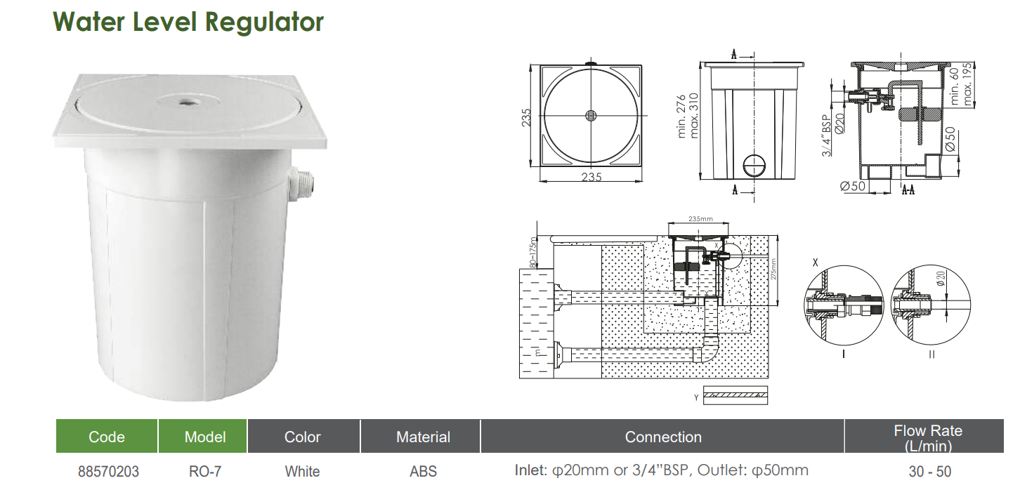 Mua tại TiktokHộp cân bằng nước Emaux RO-7 Model/ Code RO-7/ 88570203 Lưu lượng: 3 m3/h Kết nối: Vào 20m, ra 50mm Hãng sản xuất Emaux – China Bộ điều khiển mực nước tự động Emaux RO-7 được sử dụng trong các vực sâu với bê tông và tường lót. Chất liệu: nhựa ABS chống ăn mòn. Bộ điều khiển mực nước tự động Emaux RO-7 được sử dụng trong các vực sâu với bê tông và tường lót. Chất liệu: nhựa ABS chống ăn mòn. Nguyên lý hoạt động: