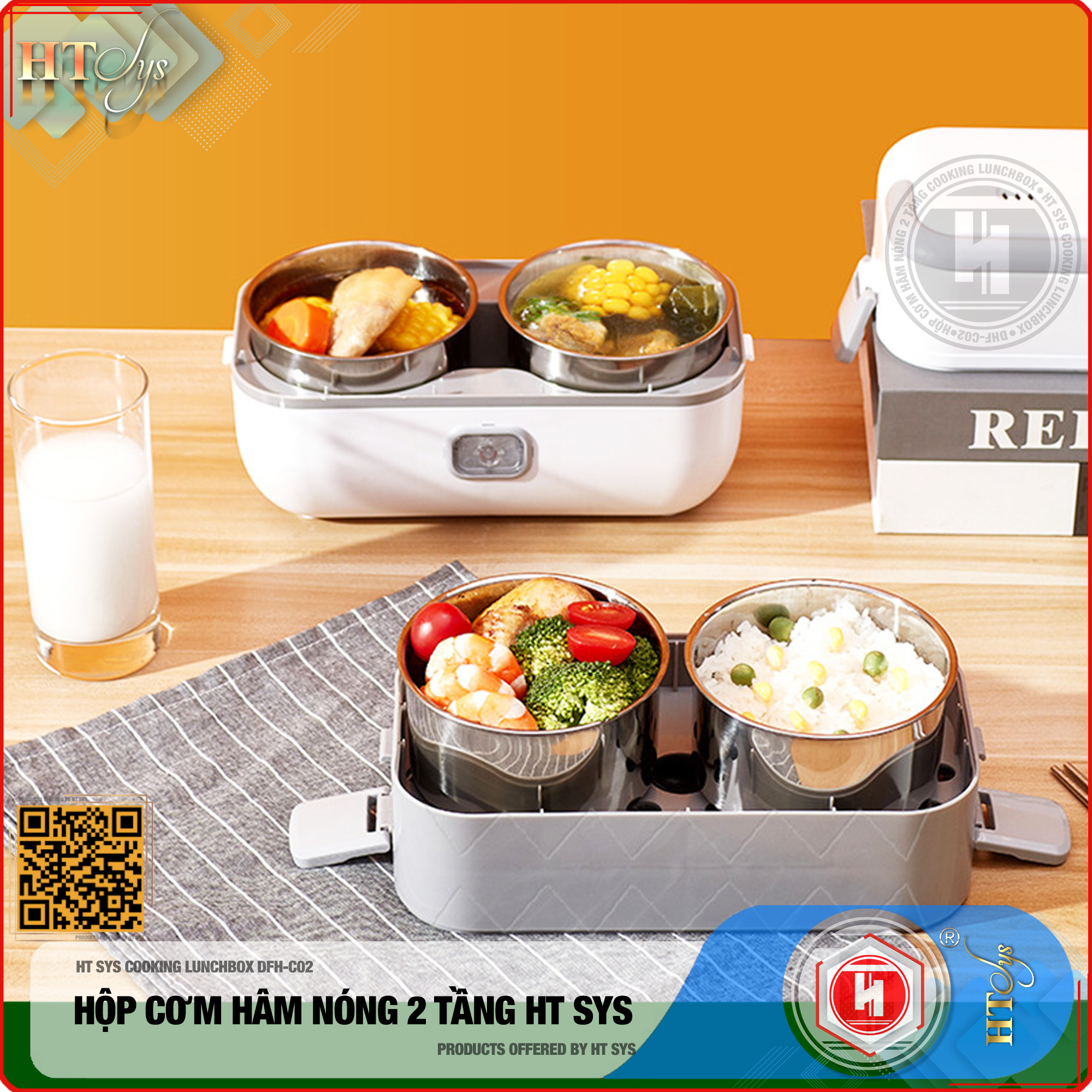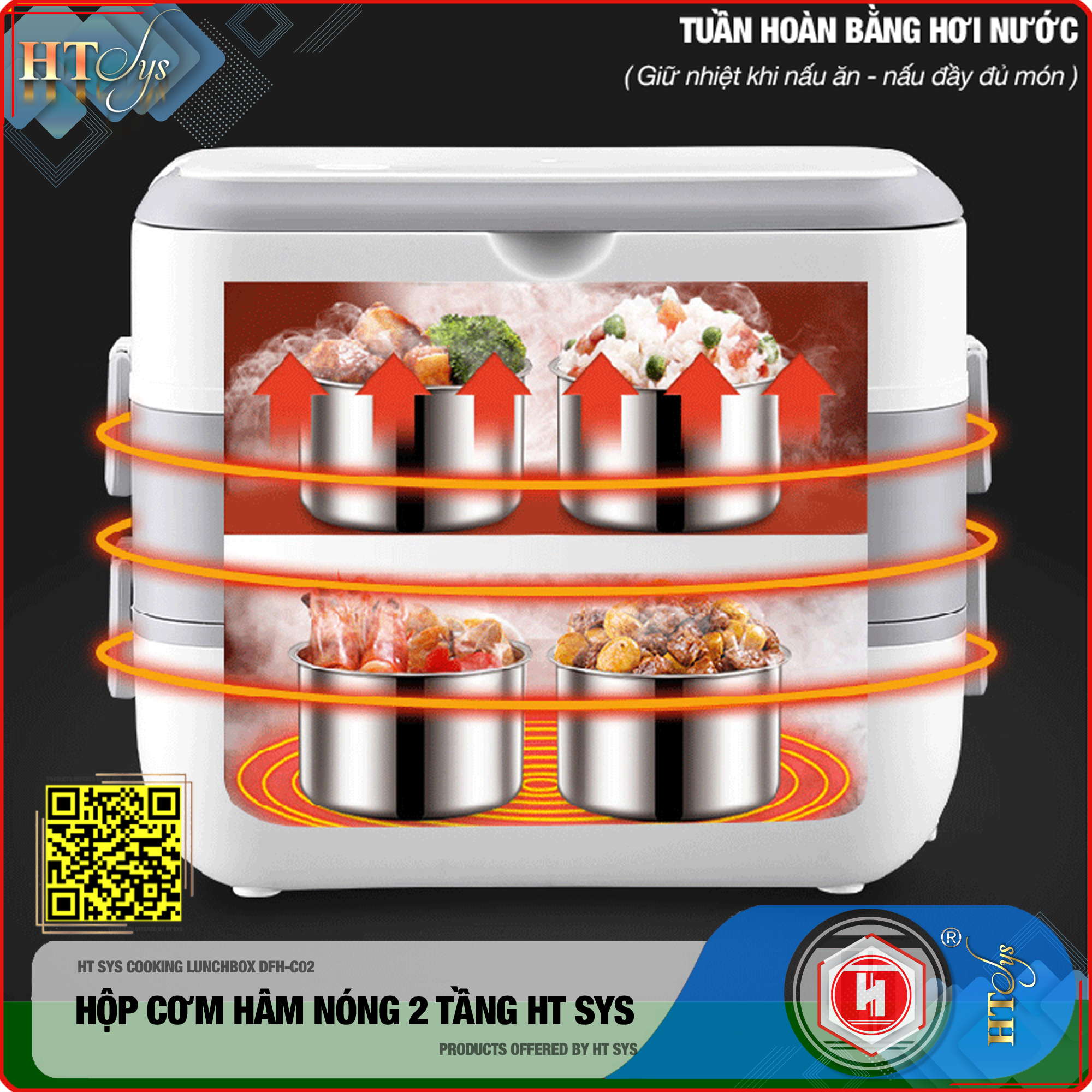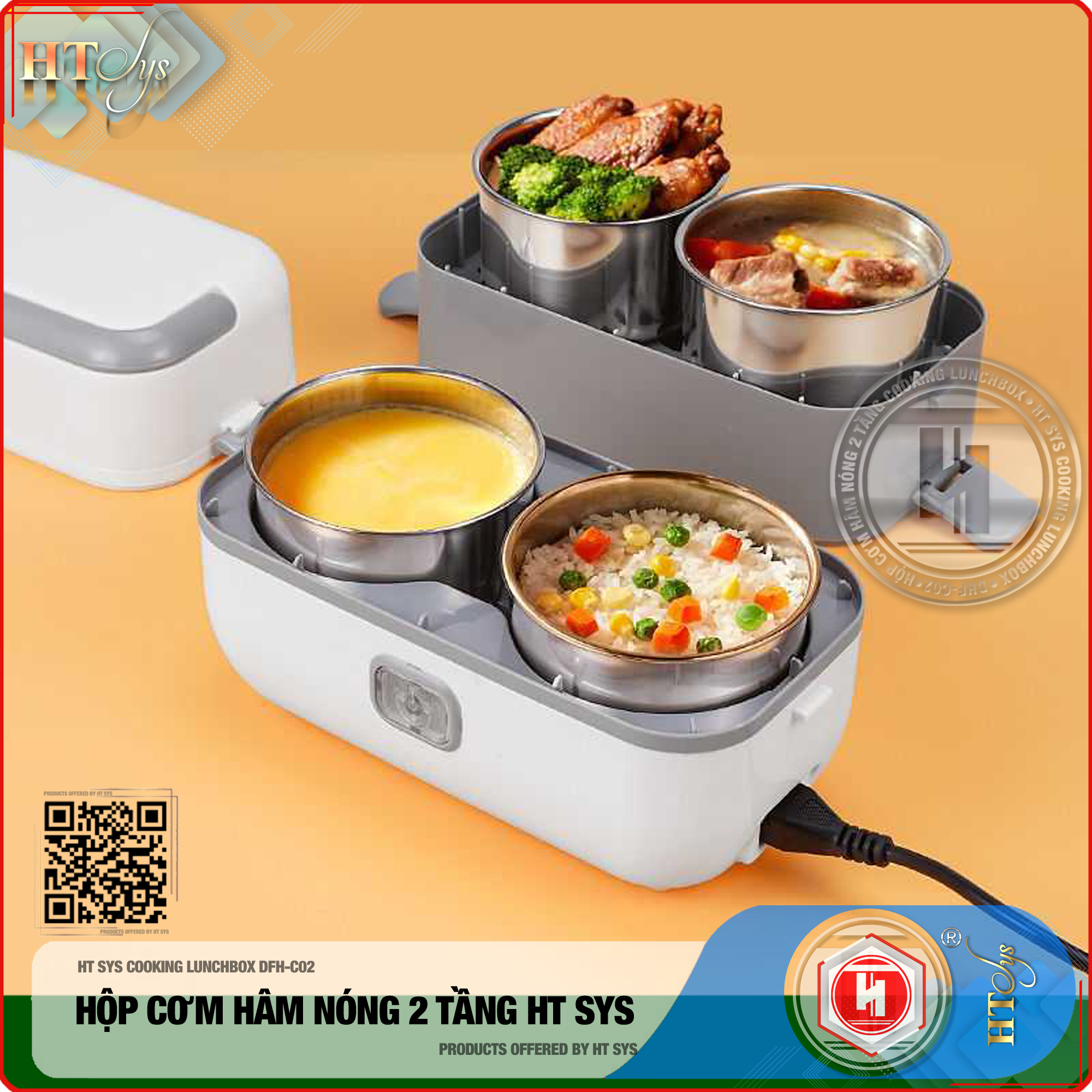 - Công dụng: hâm nóng và nấu chín thức ăn. ƯU ĐIỂM HỘP CƠM HT SYS: Bạn có thể hâm nóng thức ăn hoặc chuẩn bị thực phẩm rồi nấu bằng hộp cơm này. Với nguyên lí dùng hơi nước làm chín, hâm nóng đồ ăn nên bạn yên tâm về độ an toàn. Sản phẩm được làm từ nhựa PP an toàn tuyệt đối cho người sử dụng. Bao gồm 2 tầng và 4 hộp cơm inox nên bạn sẽ yên tâm về bữa ăn đầy đủ dinh dưỡng. Bạn sẽ tiết kiệm thời gian, không cần chuẩn bị nhiều thứ rờm rà. Thích hợp với tất cả mọi lứa tuổi, đặc biệt là học sinh, sinh viên và dân văn phòng… CÁC BƯỚC SỬ DỤNG HỘP CƠM CẮM ĐIỆN HT SYS: Bước 1: Cho lượng nước 250ml cần thiết vào thân hộp. Khi cắm điện, đế nhiệt sẽ đun sôi lượng nước này. Bước 2: Cho đồ ăn cần hâm nóng hoặc đồ ăn sống vào các hộp đựng sau đó đóng chặt nắp gài.(Lưu ý khi đun cần bỏ nắp đậy của các bát inox ra ngoài để tránh nhiệt lượng quá cao làm vênh nắp).