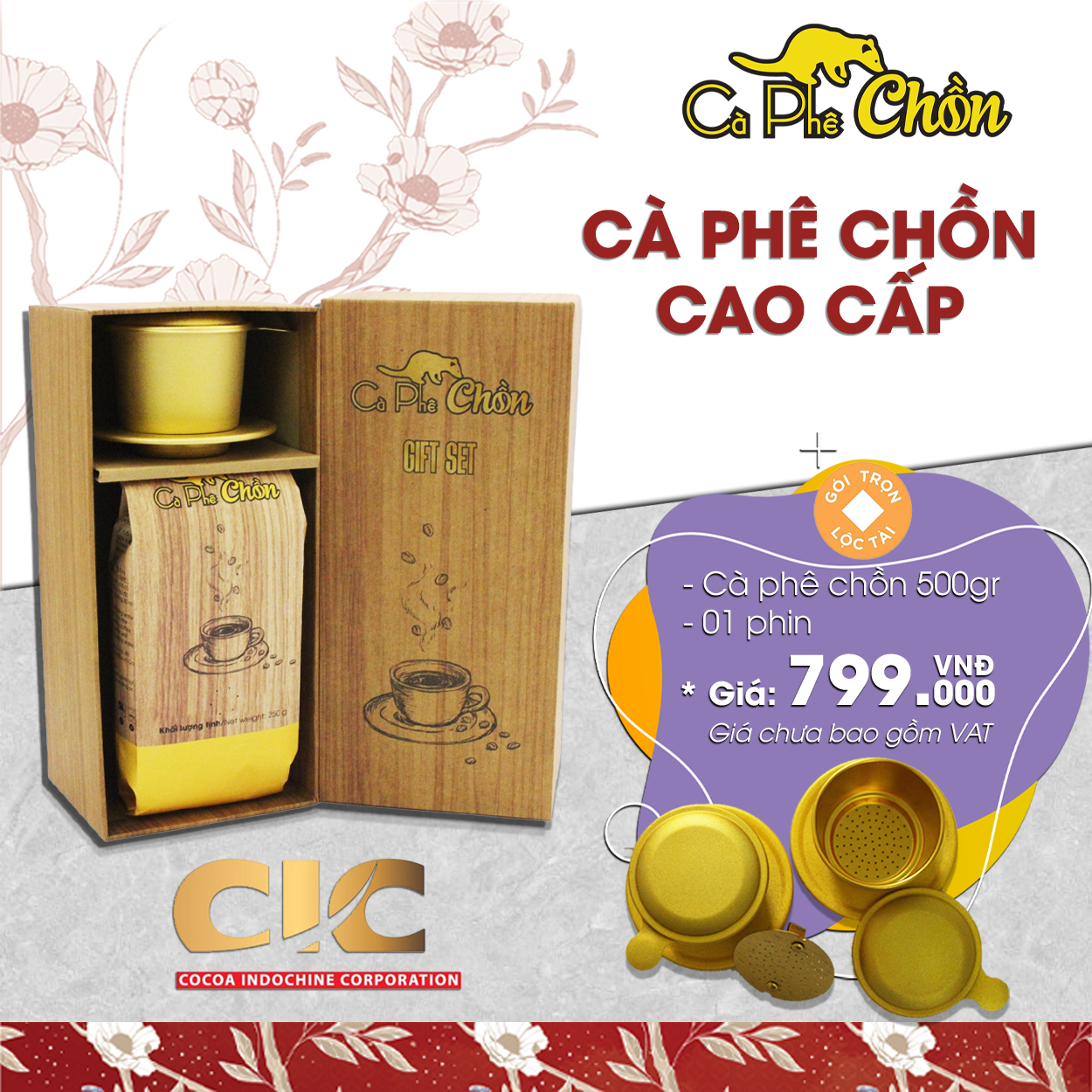 - Sản phẩm gồm: + 1 túi cà phê chồn 500g + 1 phin cà phê mạ màu công nghệ anod đẹp + 1 hộp đựng bằng gỗ nhẹ.