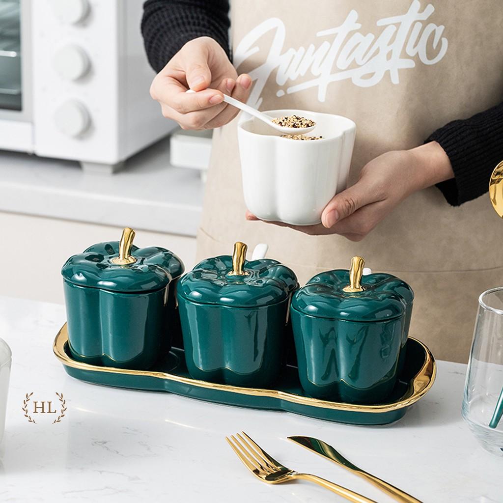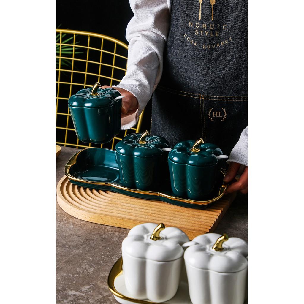 ✨HŨ ĐỰNG GIA VỊ BẰNG SỨ KIỂU DÁNG ỚT CHUÔNG PHONG CÁCH VINTAGE | BỘ GIA VỊ SỨ 3 KÈM ĐẾ SỨ CAO CẤP KẺ CHỈ VÀNG KIM DECOR