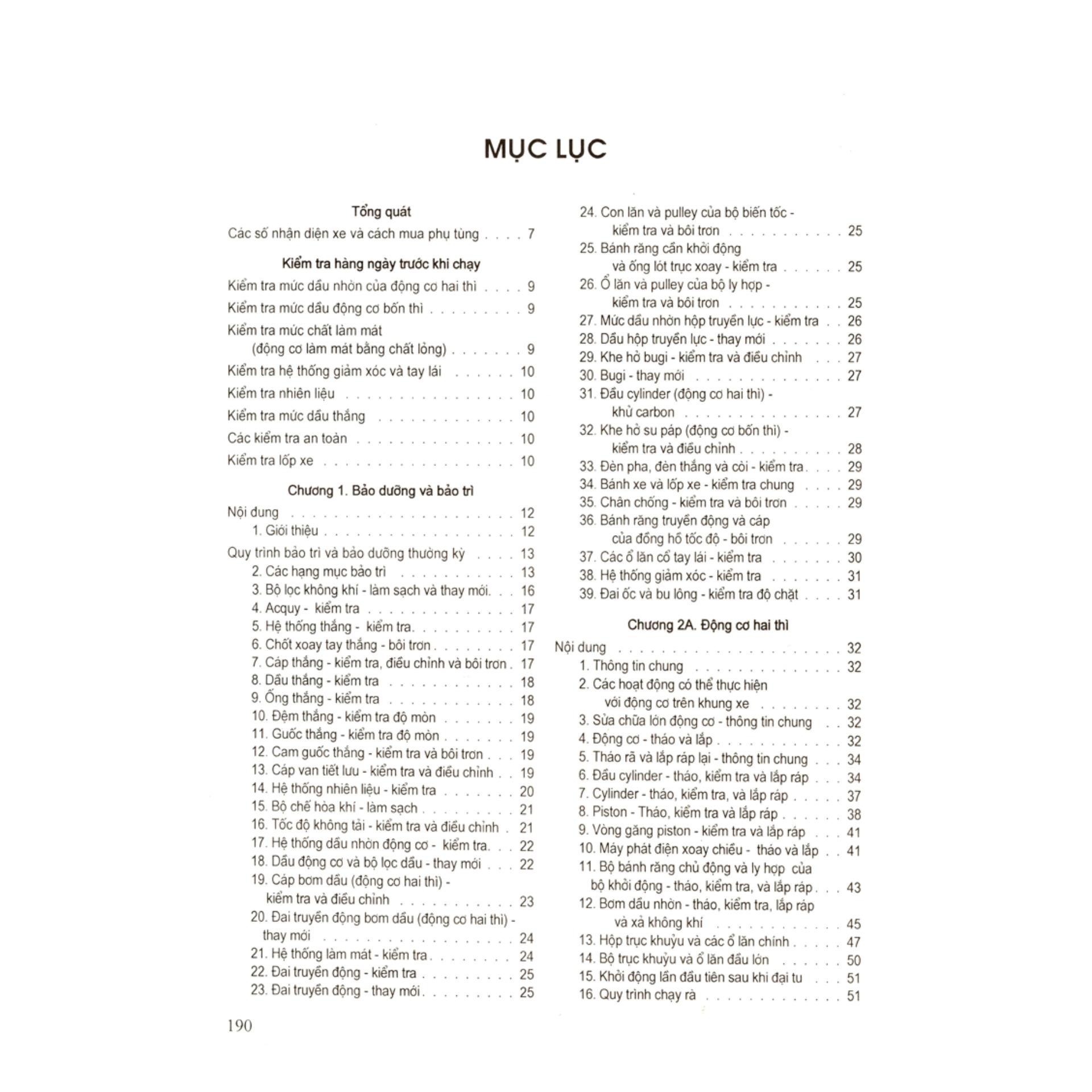Cuốn sách này trình bày các hệ thống trên xe tay ga theo từng chương riêng biệt, với đầy đủ quy trình tháo lắp, kiểm tra, và thay các bộ phận của hệ thống. Mỗi quy trình được viết theo cách hướng dẫn từng bước để bạn có thể tự thực hiện và tận hưởng cảm giác thỏa mãn sau khi hoàn thành công việc. Ngoài ra, với những công việc đơn giản, tự thực hiện còn giúp bạn tiết kiệm thời gian.