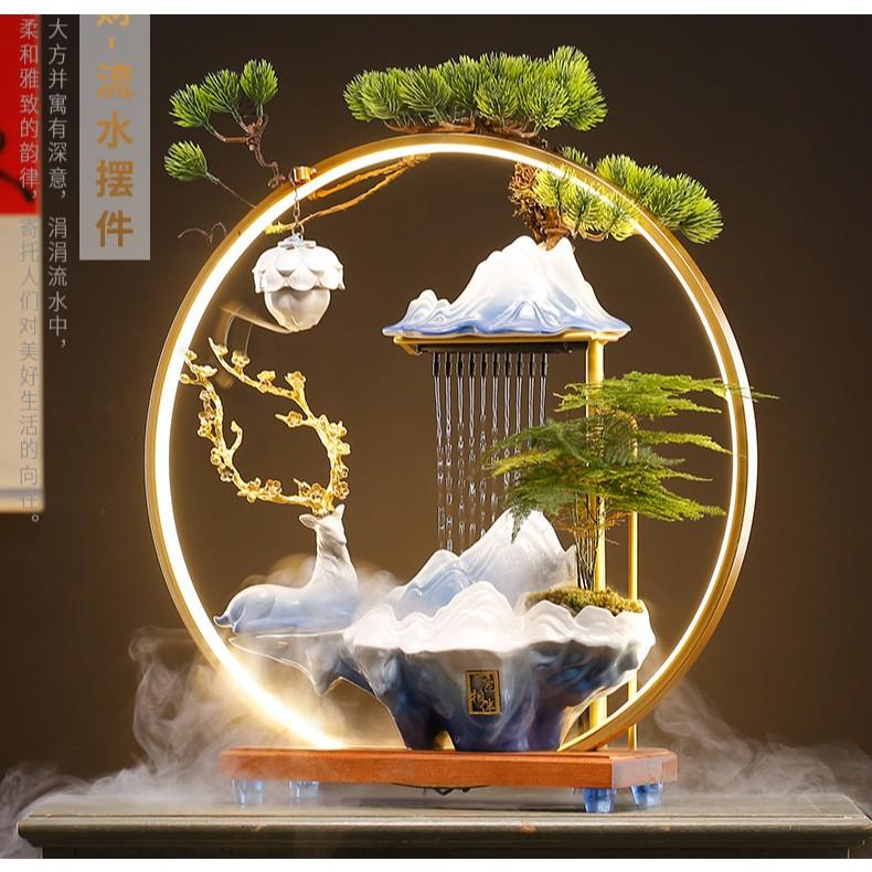 Thác nước phong thuỷ tượng hươu xanh đỏ , thác khói trầm hương kèm kệ đèn led hào quang trang trí