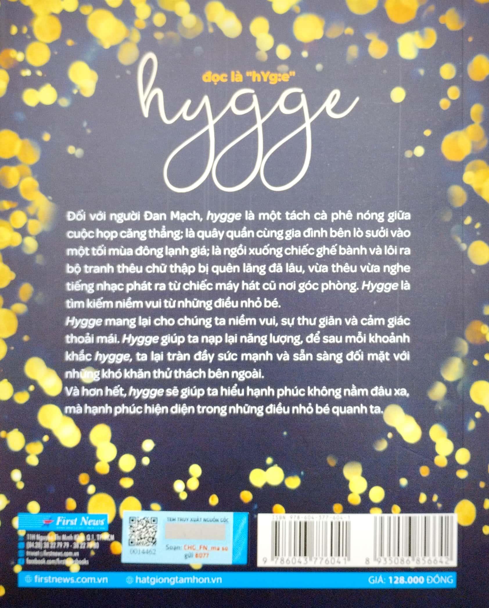 Chẳng có định nghĩa chung, thống nhất nhưng sau toàn bộ nội dung tác phẩm, người đọc sẽ cảm nhận được tinh thần của Hygge và tự chọn được cách Hygge cho mình. Như lời của Anne Glad, chuyên gia hàng đầu thế giới về lối sống, có thể hygge không phải là đáp án cho mọi câu hỏi lớn trong cuộc sống, nhưng chắc chắn hygge là một lời mời gọi chúng ta suy nghĩ về cuộc sống và hạnh phúc dưới một góc nhìn rộng hơn. Điều gì là quan trọng đối với chúng ta? Chúng ta cần làm việc nhiều đến mức nào? Và chúng ta cần gì để hạnh phúc? Hygge là lời mời gọi tận hưởng những thứ nhỏ bé trong cuộc sống, bởi vì thật ra đó chính là những điều to lớn.