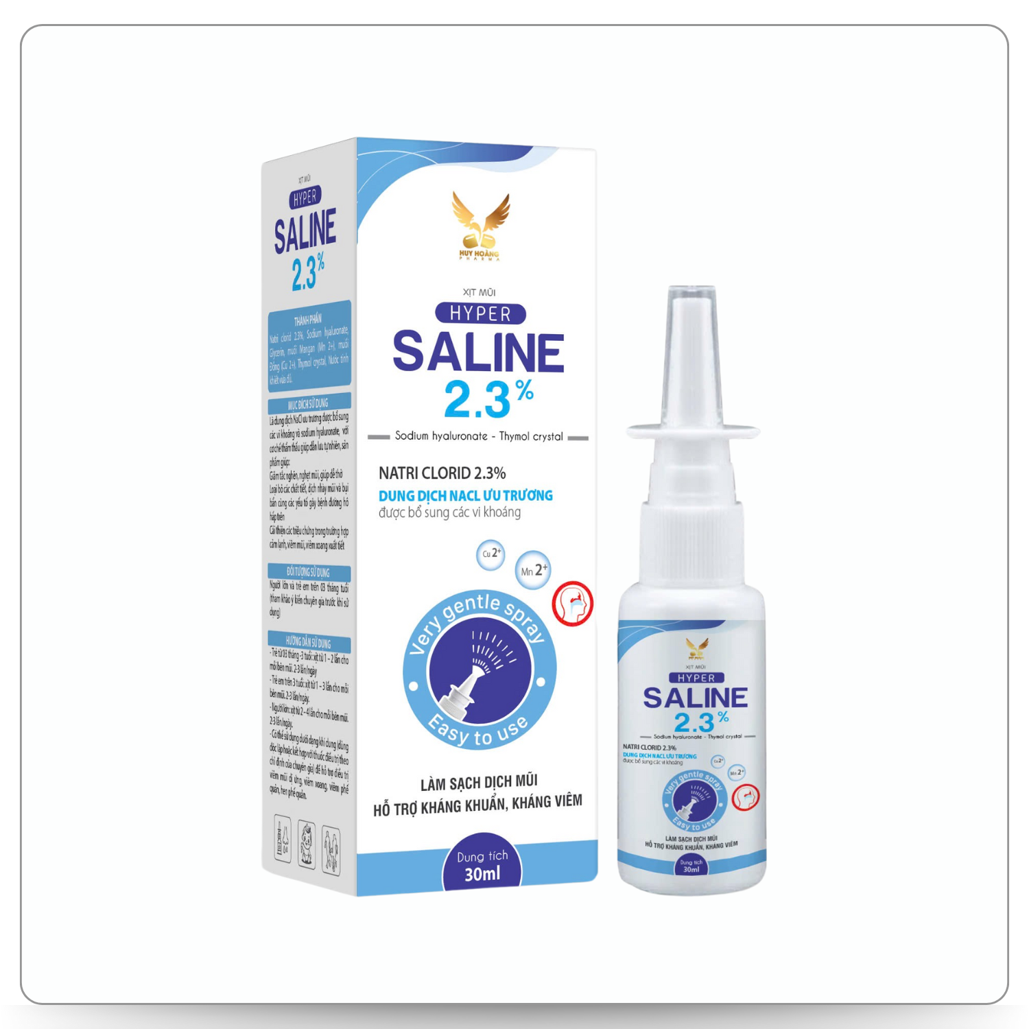 Hyper Saline 2,3% chứa Natri clorid 2,3%, sodium hyaluronate,… giúp giảm tắc nghẽn, nghẹt mũi, giúp dễ thở; loại bỏ các chất tiết, dịch nhầy mũi và bụi bẩn cùng các yếu tố gây bệnh đường hô hấp trên.