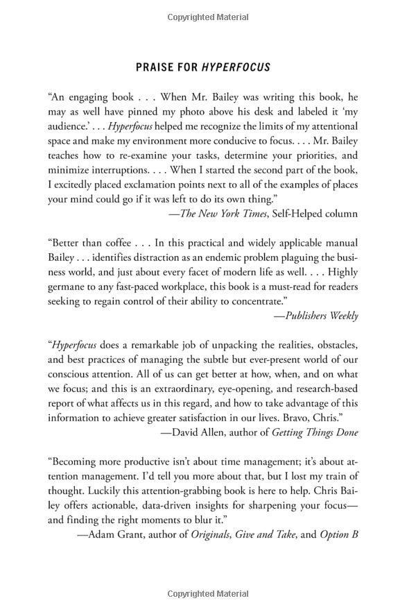Hyperfocus: How To Work Less To Achieve More 'The most productive man you'd ever hope to meet' TED Hyperfocus by Chris Bailey is a practical guide to managing your attention – the most powerful ...