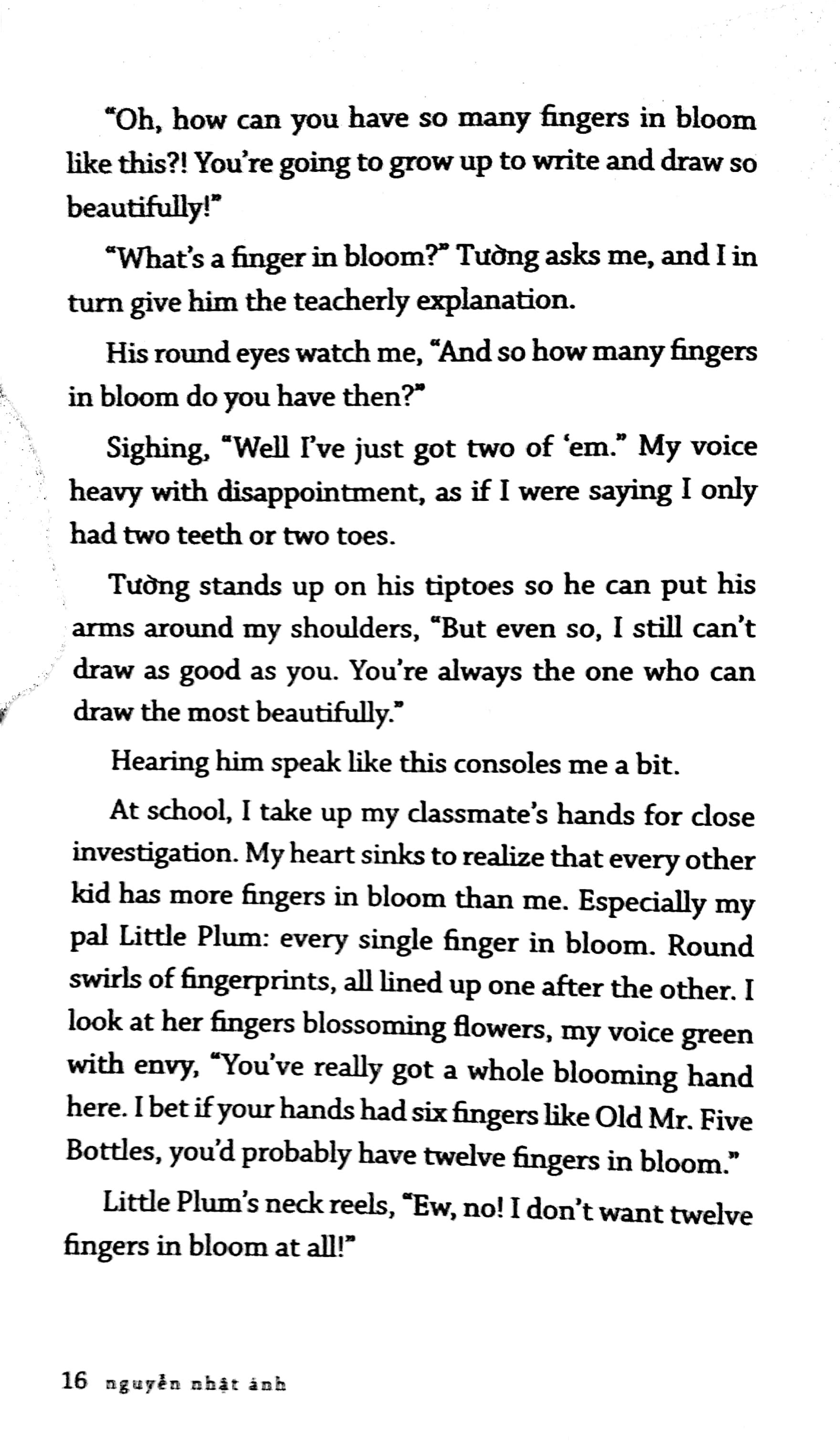 Koike Natsu, a college sophomore in Tokyo, wrote to me after reading the Japanese translation of this story: “I see yellow flowers in the green grass stirs my nostalgia for innocent days. When I were little, I also used to play with a toad just like Tường, but I no longer see those animals around my house anymore. People from the city often say, ‘the countryside is so boring, there's nothing happening there.’ But I don't think the same. There's so much in villages to learn about, as your book shows us. Thiều's village is full of beautiful landscapes, grasses and trees, wind, plus all kind of insects. In Tokyo, such serene spaces are being lost day by day. I have a great nostalgia for them.”