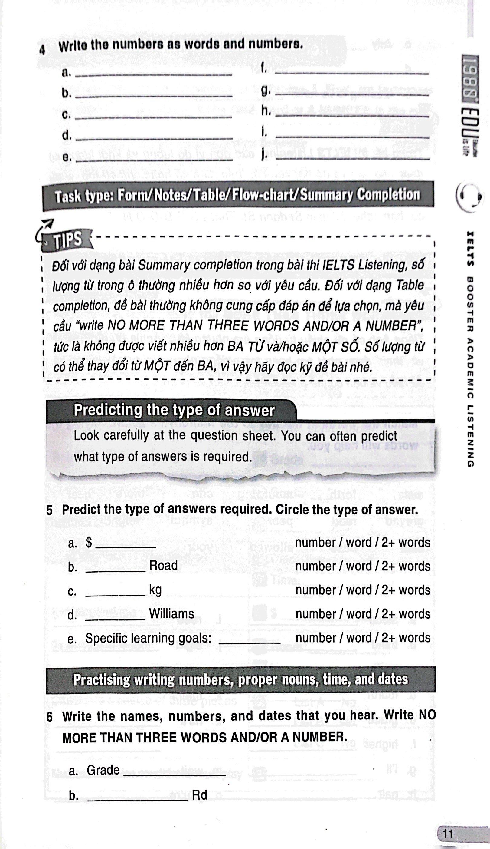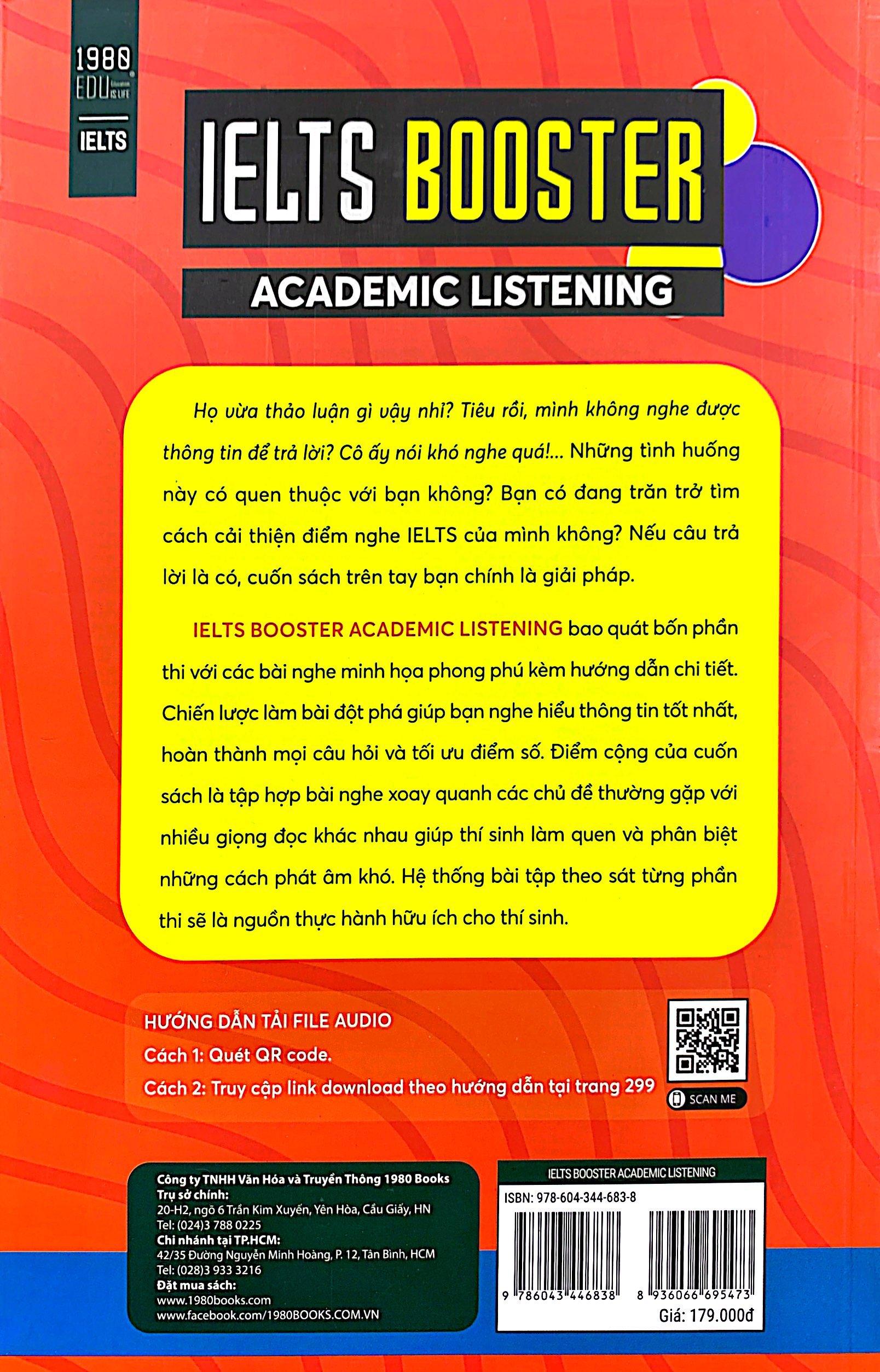 IELTS BOOSTER ACADEMIC LISTENING bao quát bốn phần thi với các bài nghe minh hoạ phong phú kèm hướng dẫn chi tiết. Chiến lược làm bài đột phá giúp bạn nghe hiểu thông tin tốt nhất, hoàn thành mọi câu hỏi và tối ưu điểm số. Điểm cộng của cuốn sách là tập hợp bài nghe xoay quanh các chủ đề thường gặp với nhiều giọng đọc khác nhau, giúp thí sinh làm quen và phân biệt những cách phát âm khó. Hệ thống bài tập theo sát từng phần thi sẽ là nguồn thực hành hữu ích cho thí sinh.