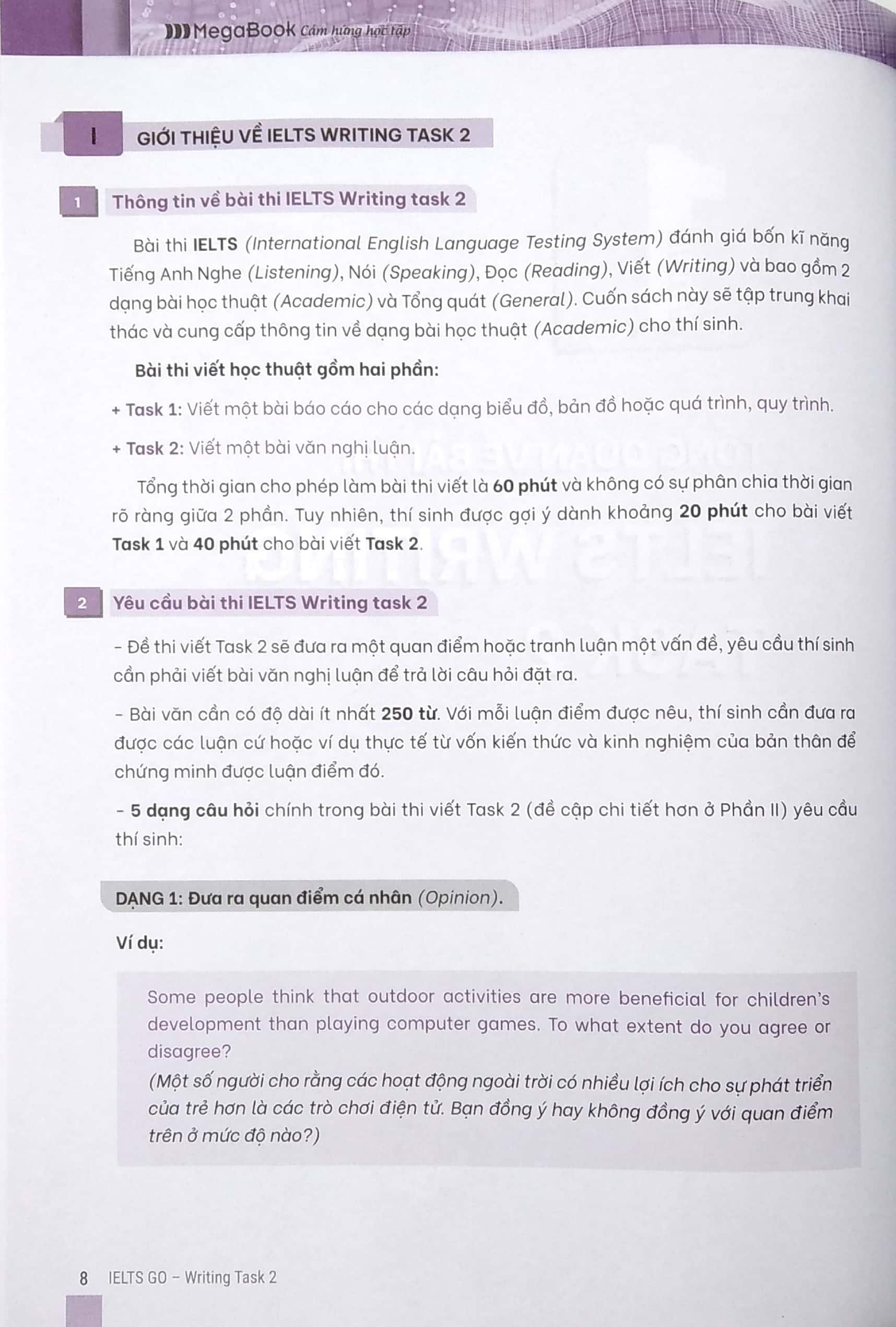 Nội dung cuốn sách "IELTS GO - Writing task 2 - Dàn ý mẫu cho tất cả các dạng bài" được hệ thống một cách khoa học, logic: