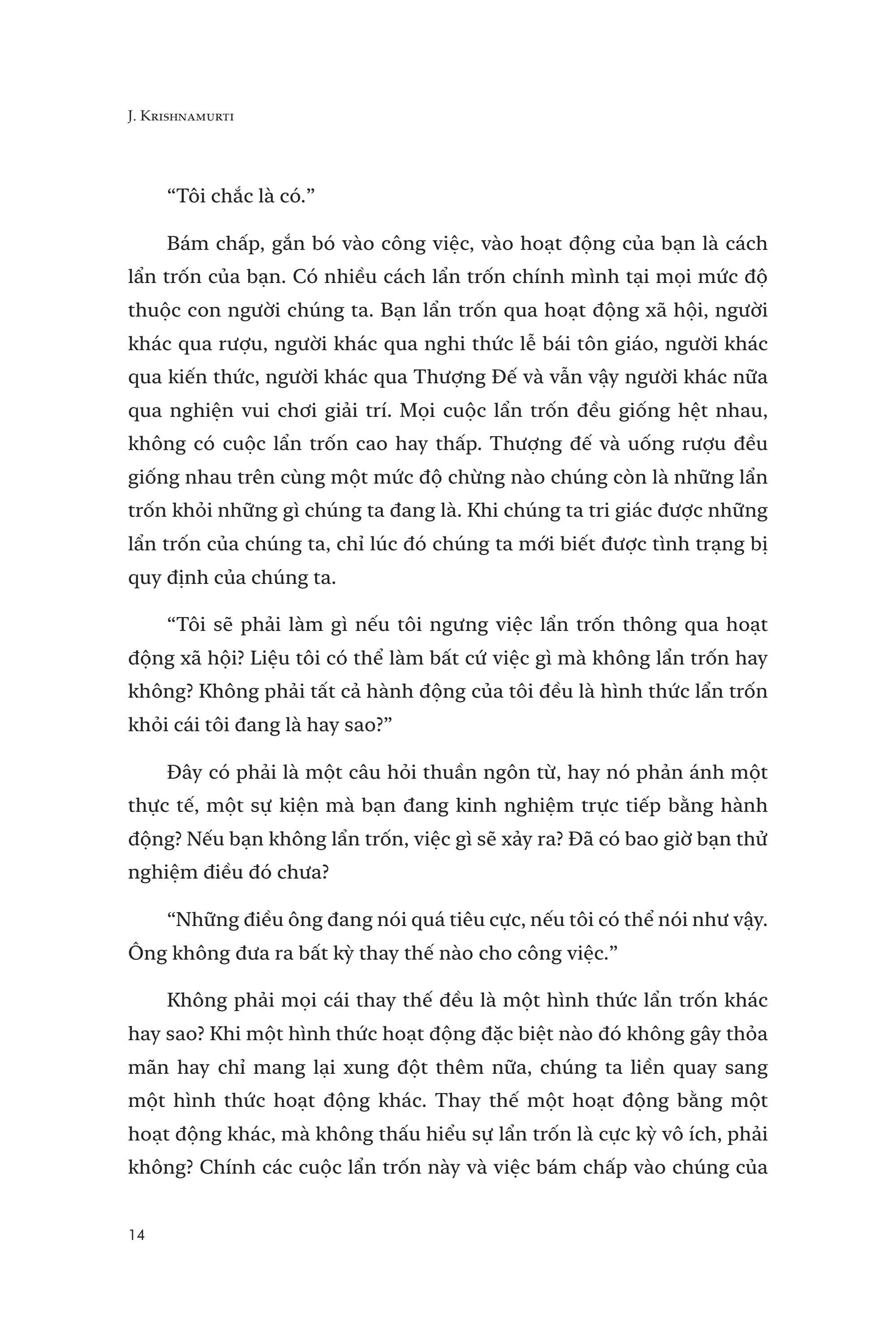Qua những buổi nói chuyện ngắn gọn, Krishnamurti đã chỉ ra chính vấn đề mới quan trọng, chứ không phải câu trả lời. Nếu chúng ta tìm kiếm một lời giải, chúng ta sẽ tìm thấy; nhưng vấn đề sẽ vẫn còn y nguyên, bởi vì lời giải không liên quan gì với vấn đề. Công cuộc tìm kiếm của chúng ta là nhằm lẩn trốn vấn đề, và lời giải là một cách cực kỳ hời hợt, nông cạn, vì vậy không có thấu hiểu vấn đề. Tất cả những vấn đề nảy sinh từ một nguồn cội, và nếu không thấu hiểu nguồn gốc ấy, bất kỳ cố gắng nào để giải quyết những vấn đề chỉ dẫn đến hỗn loạn và đau khổ thêm mà thôi.