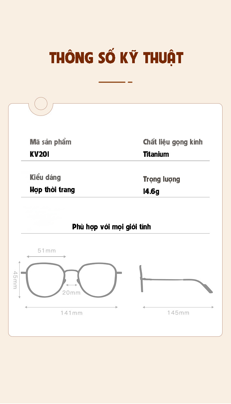 Kiểu dáng gọng kính thanh lịch, dễ đeo, phù hợp với mọi khuôn mặt nam và nữ.