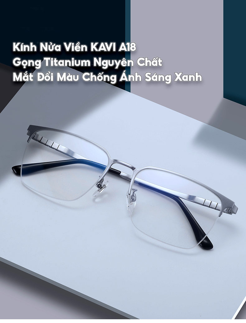 KAVI A18 – Kính nửa viền gọng Titanium nguyên chất, đổi màu nhanh khi ra nắng và chống ánh sáng xanh, bảo vệ mắt toàn diện cả trong nhà và ngoài trời Đặc Điểm