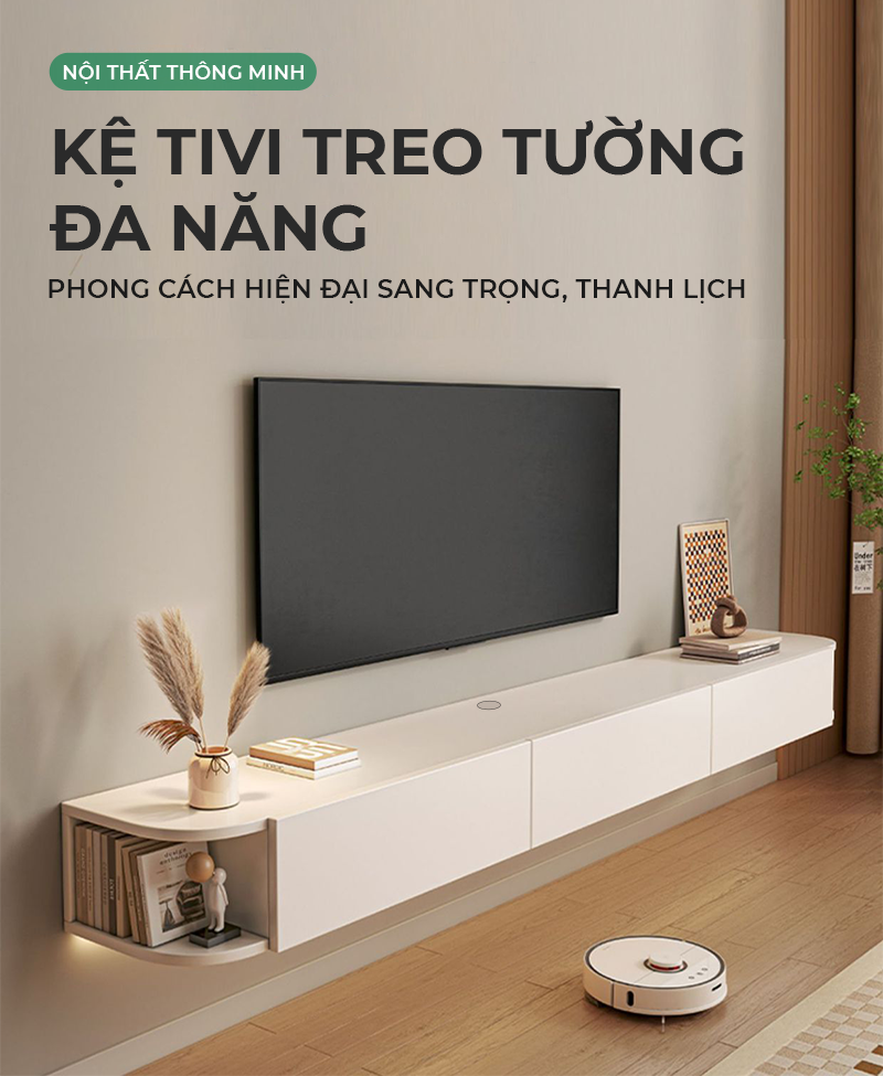 Công năng: Là mẫu kệ tivi có thiết kế hiện đại và đẹp mắt treo tường giúp không gian phòng rộng hơn.