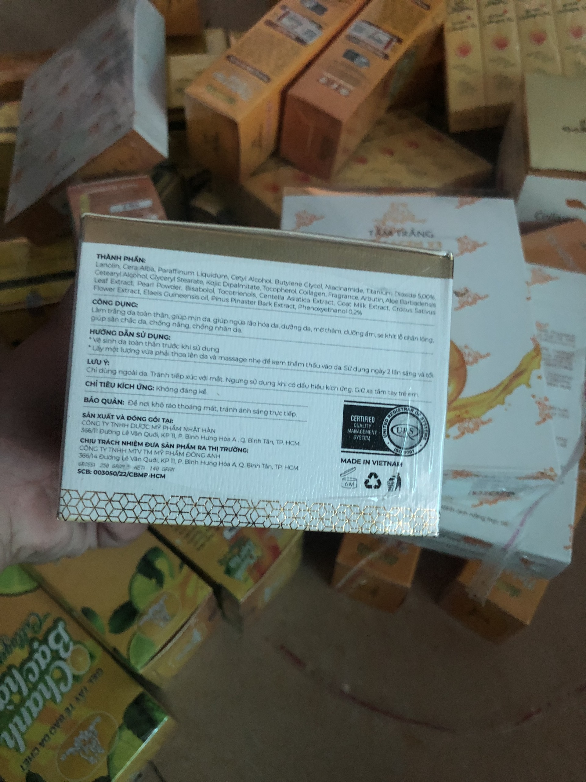 TÊN SẢN PHẨM: WHITENING BODY CREAM SPF 50 PA+++ KEM NGỌC TRAI – COLLAGEN Thành phần: Water, Hydrogenated polyisobutene, Cyclopentasiloxane, Dimethicone, Glycerin, Sodium polyacrylate, C13-14 iso paraffin, laureth-7, Titannium dioxide, Isopropyl palmitate, Niacinamide, Talc, Aloe