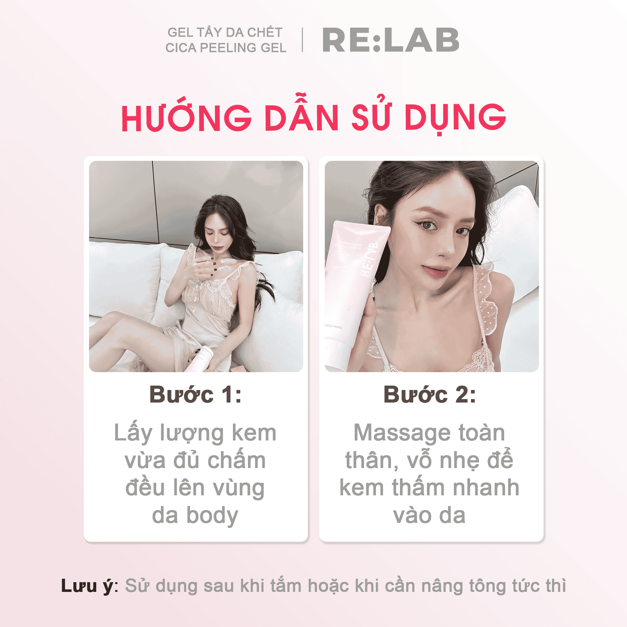 - Phục hồi và bảo vệ hàng rào tự nhiên của da, giảm kích ứng và làm dịu da Hướng dẫn sử dụng Kem dưỡng thể RE:LAB Whitening Body Lotion 200ml