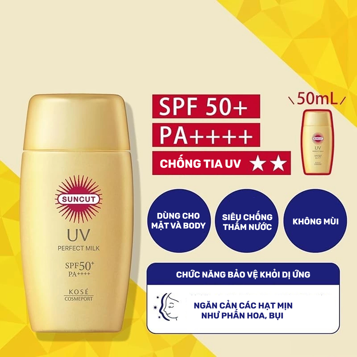Thương hiệu: Kose Xuất xứ: Nhật Bản HSD: 3 năm kể từ ngày sản xuất Khối lượng tịnh: 80g, 120g Thể tích thực: 50ml Sản phẩm có chỉ số chống nắng cao SPF50+PA++++ với khả năng siêu chống thấm nước, mồ hôi và dầu thừa, giúp bảo vệ da khỏi các tác hại của tia UV (UVA, UVB), có hiệu quả kéo dài nhiều giờ sau khi thoa với công thức không thấm nước (thích hợp khi đi bơi)…Có thể dùng thay thế lớp lót trang điểm để giữ lớp nền bám lâu trên da.Đặc biệt chất sản phẩm mỏng nhẹ , không bết rít và có thể dưỡng ẩm da bởi Collagen và các thành phần tự nhiên trong sản phẩm. Công Dụng Kem Chống Nắng Siêu Chống Thấm Nước Kose Suncut UV Perfect Essence Super Water Proof SPF50+ PA++++: Sản phẩm chống nắng giúp bảo vệ da dưới tác động của ánh nắng mặt trời, giúp làm trắng da, dưỡng ẩm cho da, cho làn da tươi sáng, khỏe đẹp.  Hướng Dẫn Sử Dụng: Dùng buổi sáng hoặc trước khi ra nắng và thoa lớp nền, nhẹ nhàng thoa khắp mặt và toàn thân. Nên thoa lại sau khi dùng khăn lau, đìều này đảm bảo tối ưu việc bảo vệ da khỏi tác hại từ tia UV. Thành Phần Kem Chống Nắng Siêu Chống Thấm Nước Kose Suncut UV Perfect Essence Super Water Proof SPF50+ PA++++: Water (aqua), Alcohol, Ethylhexyl Methoxycinnamate, Isododecane, Polysilicone-15, Silica , Diethylamino Hydroxybenzoyl Hexyl Benzoate, Bis-ethylhexyloxyphenol, Methoxyphenyl Triazine, Dipropylene Glycol, Propylene Glycol Dicaprate, Silica Dimethyl Silylate, Triethanolamine, Polyhydroxystearic Acid, Methylparaben, Anthemis Nobilis Flower Extract, Calendula Officinalis Flower Extract, Centaurea Cyanus Flower Extract, Chamomilla Recutita (matricaria) Flower Extract, Clematis Vitalba Leaf Extract, Equisetum Arvense Extract, Fucus Vesiculosus Extract, Hedera Helix (ivy) Extract, Hypericum Perforatum Flower Leaf/stem Extract, Sodium Hyaluronate, Soluble Collagen, Spiraea Ulmaria Extract, Tilia Cordata Flower Extract, Acrylates Copolymer, Acrylates/c10-30 Alkyl Acrylate Crosspolymer, Bht, Butylene Glycol, Disodium Edta, Peg-10 Hydrogenated Castor Oil, Peg-40 Hydrogenated Castor Oil, Squalane, Stearoyl Inulin, Xanthan Gum, Phenoxyethanol  Bảo quản: Tránh để nơi quá lạnh và ánh nắng trực tiếp vào sản phẩm để xa tầm tay trẻ em khi không sử dụng. Lưu ý: Khi dùng nếu có biểu hiện mẩn ngứa hay triệu chứng gì bất thường thì ngưng không sử dụng.
