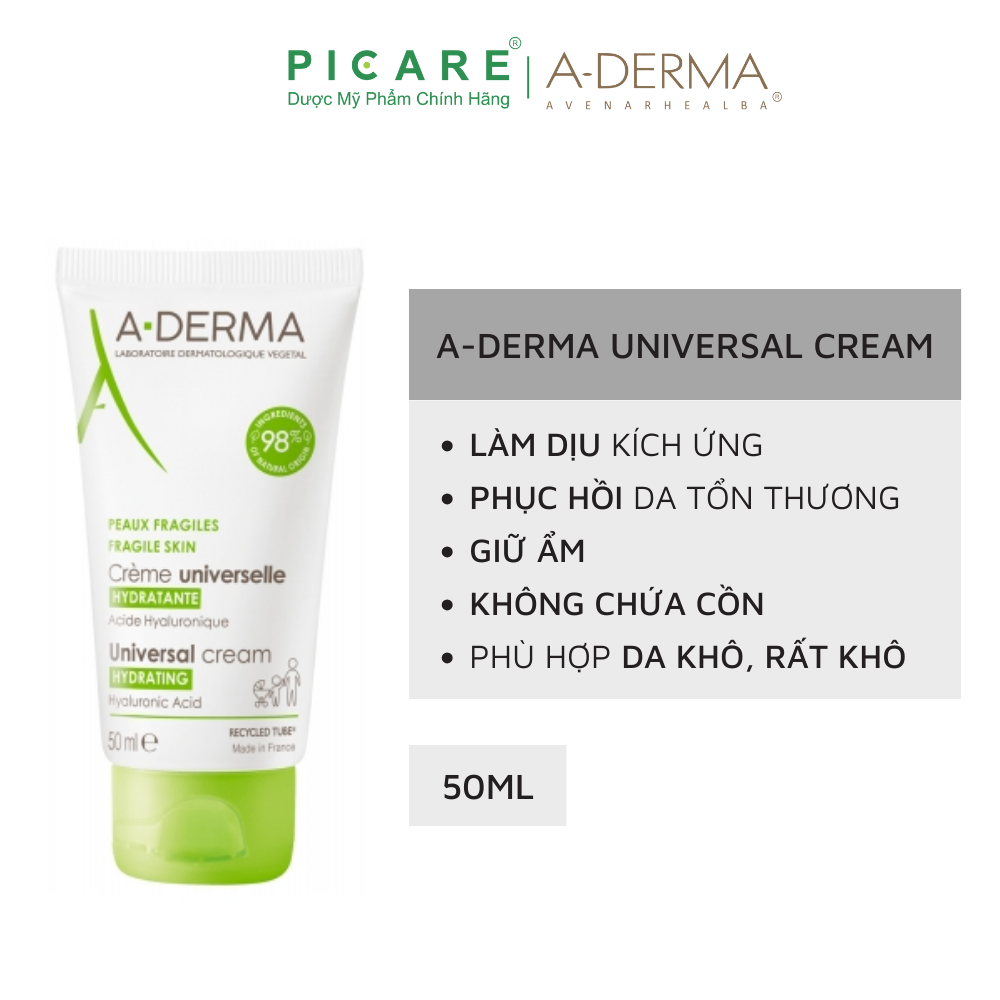 - Kem Dưỡng Ẩm Hằng Ngày Cho Da Mỏng Manh A-Derma Universal Cream Hydrating 50ml giúp làn da kích ứng được làm dịu và tạo độ ẩm cho da, khôi phục và cân bằng sinh lý da.
