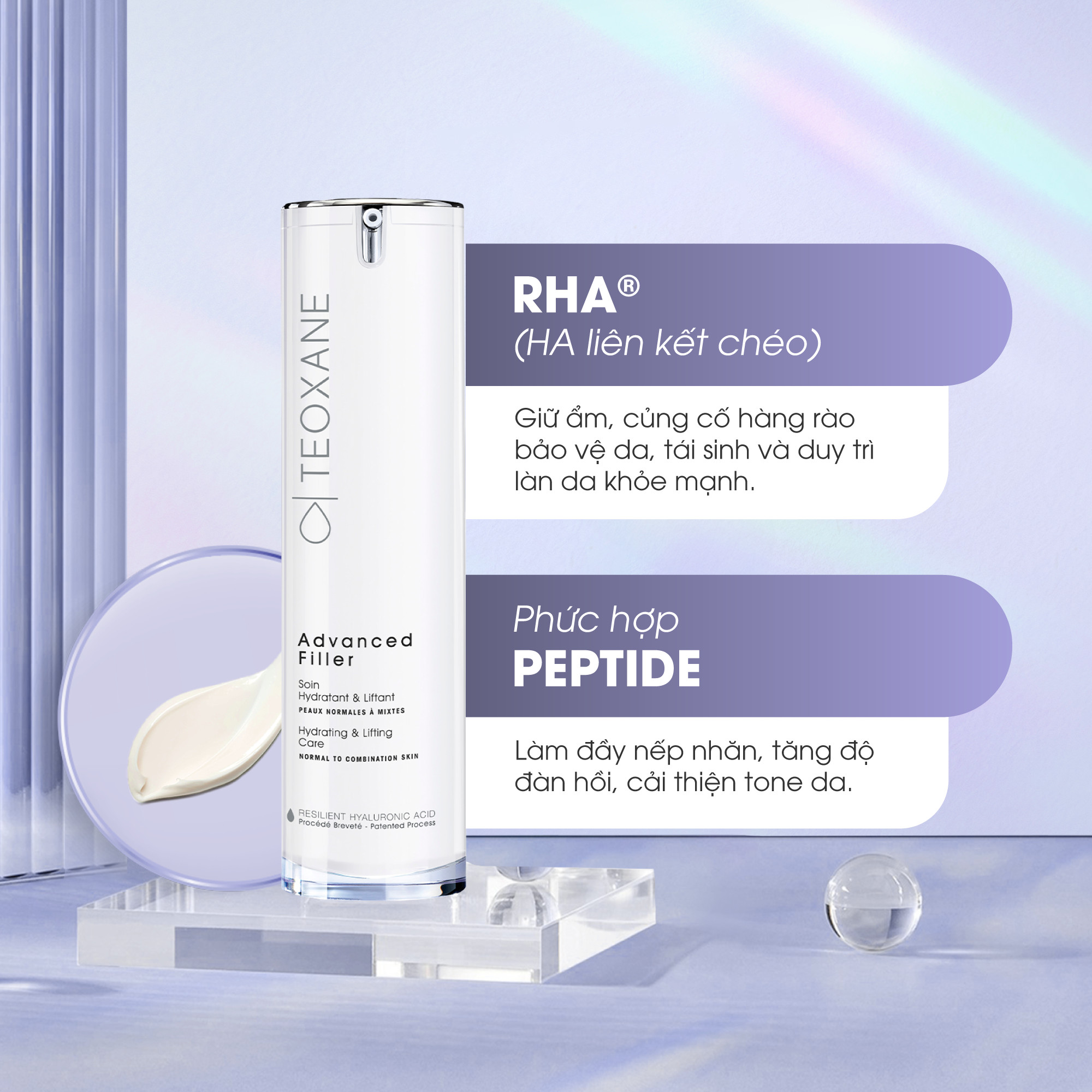 CÔNG THỨC CỐT LÕI Sự kết hợp giữa các hoạt chất có tác dụng hiệp đồng nhằm mang lại đáp ứng tối ưu cho các vấn đề lão hóa da RHA : Resilient Hyaluronic Acid CỦNG CỐ HÀNG RÀO BẢO VỆ DA VÀ DƯỠNG ẨM KÉO DÀI ĐEM LẠI SỨC SỐNG MỚI VÀ BẢO VỆ DA NovHyal : Các thành phần tự nhiên của Hyaluronic Acid KÍCH THÍCH VÀ TÁI TẠO HYALURONIC ACID TỰ NHIÊN CỦA CƠ THỂ Teoxane Advanced Filler Liệu pháp chăm sóc da lý tưởng cho ban ngày: Công thức giữ ẩm tối ưu với các hoạt chất chống nếp nhăn mạnh mẽ cho làn da đầy đặn và đàn hồi hơn Công thức chuyên biệt cho 2 loại da: Da khô và Da thường / Da hỗn hợp. Không gây cảm giác nhờn, dính và bóng dầu. Hướng dẫn sử dụng: Thoa lên mặt và vùng cổ, vào buổi sáng và/hoặc tối, có thể sử dụng riêng hoặc sau khi sử dụng RHA Serum